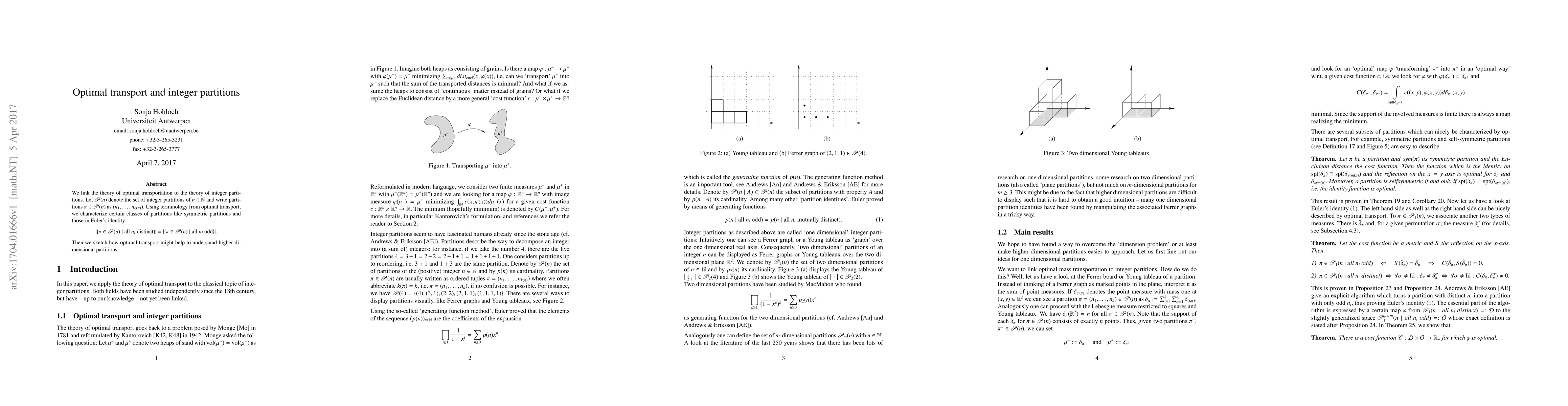 This paper establishes a connection between optimal transport theory and integer partitions, characterizing specific partition classes and demonstrating the potential of optimal transport to analyze higher-dimensional partitions. It highlights symmetric partitions and partitions fulfilling Euler's identity, showing their equal cardinality.