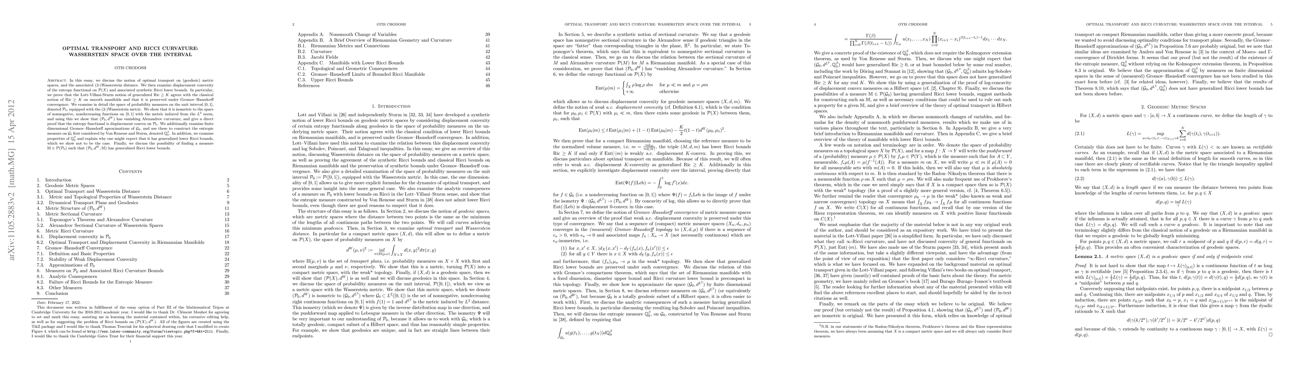 In this essay, we discuss the notion of optimal transport on geodesic measure spaces and the associated (2-)Wasserstein distance. We then examine displacement convexity of the entropy functional on the space of probability measures. In particular, we give a detailed proof that the Lott-Villani-Sturm notion of generalized Ricci bounds agree with the classical notion on smooth manifolds. We also give the proof that generalized Ricci bounds are preserved under Gromov-Hausdorff convergence. In particular, we examine in detail the space of probability measures over the interval, $P(X)$ equipped with the Wasserstein metric $d^W$. We show that this metric space is isometric to a totally convex subset of a Hilbert space, $L^2[0,1]$, which allows for concrete calculations, contrary to the usual state of affairs in the theory of optimal transport. We prove explicitly that $(P(X),d^W)$ has vanishing Alexandrov curvature, and give an easy to work with expression for the entropy functional on this space. In addition, we examine finite dimensional Gromov-Hausdorff approximations to this space, and use these to construct a measure on the limit space, the entropic measure first considered by Von Renesse and Sturm. We examine properties of the measure, in particular explaining why one would expect it to have generalized Ricci lower bounds. We then show that this is in fact not true. We also discuss the possibility and consequences of finding a different measure which does admit generalized Ricci lower bounds.