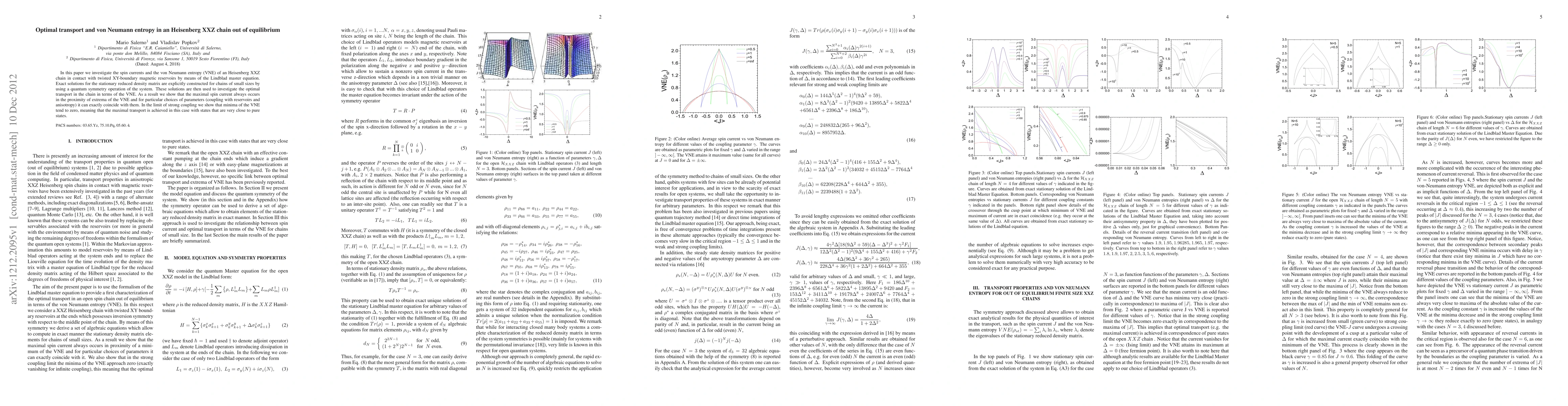 In this paper we investigate the spin currents and the von Neumann entropy (VNE) of an Heisenberg XXZ chain in contact with twisted XY-boundary magnetic reservoirs by means of the Lindblad master equation. Exact solutions for the stationary reduced density matrix are explicitly constructed for chains of small sizes by using a quantum symmetry operation of the system. These solutions are then used to investigate the optimal transport in the chain in terms of the VNE. As a result we show that the maximal spin current always occurs in the proximity of extrema of the VNE and for particular choices of parameters (coupling with reservoirs and anisotropy) it can exactly coincide with them. In the limit of strong coupling we show that minima of the VNE tend to zero, meaning that the maximal transport is achieved in this case with states that are very close to pure states.