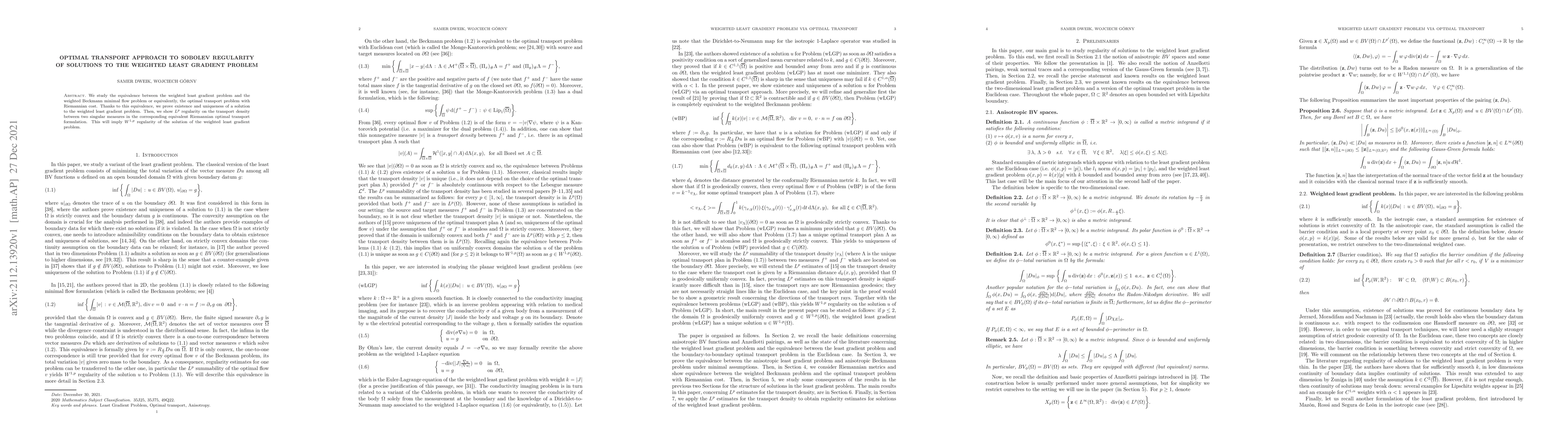 We study the equivalence between the weighted least gradient problem and the weighted Beckmann minimal flow problem or equivalently, the optimal transport problem with Riemannian cost. Thanks to this equivalence, we prove existence and uniqueness of a solution to the weighted least gradient problem. Then, we show $L^p$ regularity on the transport density between two singular measures in the corresponding equivalent Riemannian optimal transport formulation. This will imply $W^{1,p}$ regularity of the solution of the weighted least gradient problem.