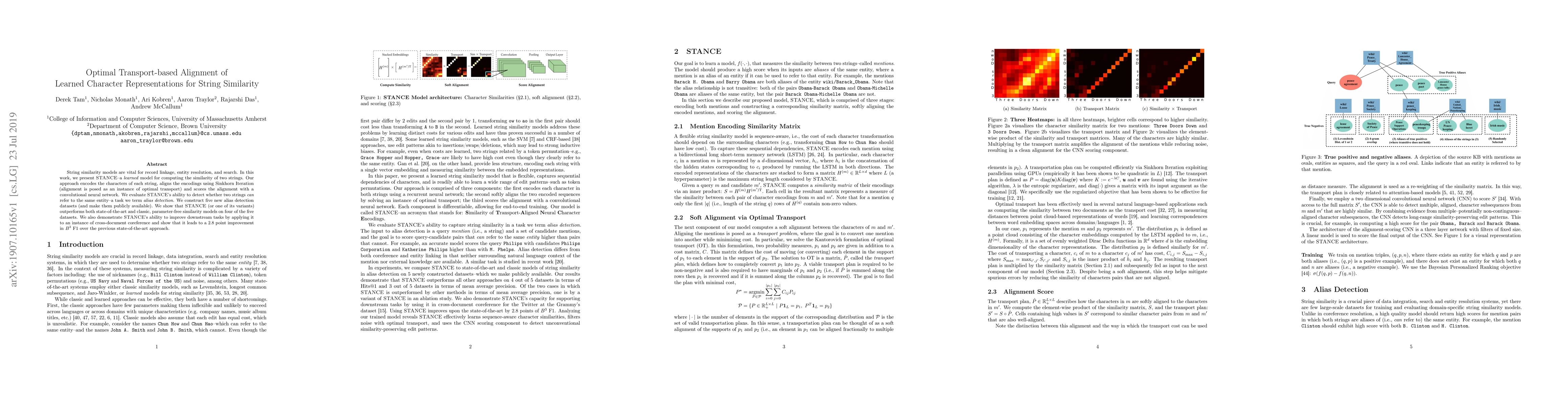 The paper introduces STANCE, a learned model for string similarity using character encoding, optimal transport alignment via Sinkhorn Iteration, and CNN scoring. STANCE outperforms existing models in alias detection tasks across five new publicly available datasets, and improves cross-document coreference by 2.8 B^3 F1 points.