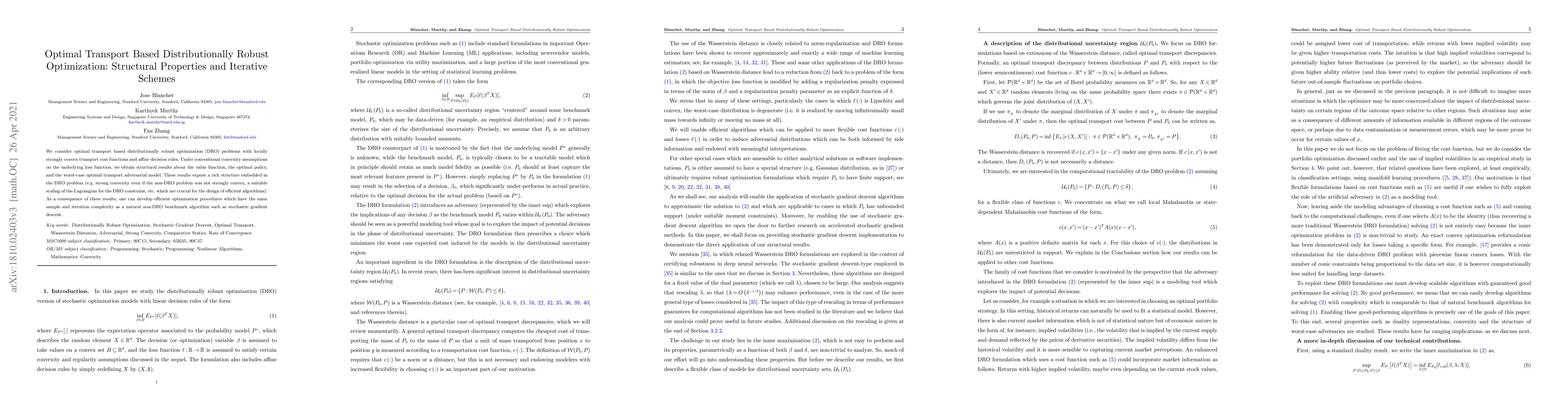 We consider optimal transport based distributionally robust optimization (DRO) problems with locally strongly convex transport cost functions and affine decision rules. Under conventional convexity assumptions on the underlying loss function, we obtain structural results about the value function, the optimal policy, and the worst-case optimal transport adversarial model. These results expose a rich structure embedded in the DRO problem (e.g. strong convexity even if the non-DRO problem was not strongly convex, a suitable scaling of the Lagrangian for the DRO constraint, etc. which are crucial for the design of efficient algorithms). As a consequence of these results, one can develop efficient optimization procedures which have the same sample and iteration complexity as a natural non-DRO benchmark algorithm such as stochastic gradient descent.