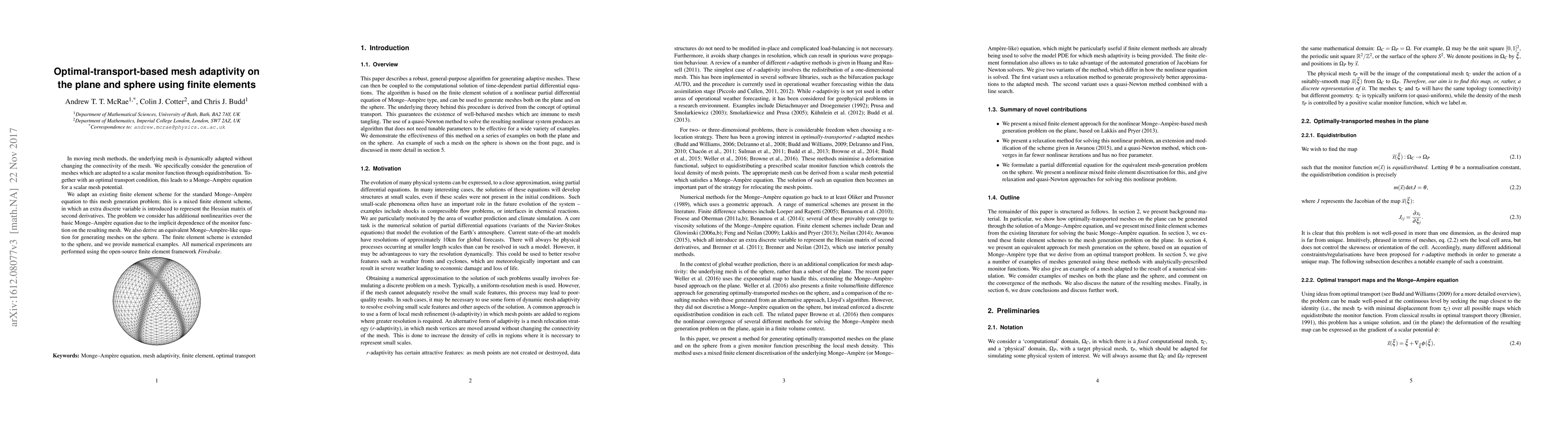 Researchers developed an optimal-transport-based mesh adaptivity method using finite elements for generating adaptive meshes on both the plane and sphere, addressing nonlinearities and providing a Monge-Ampere-like equation.