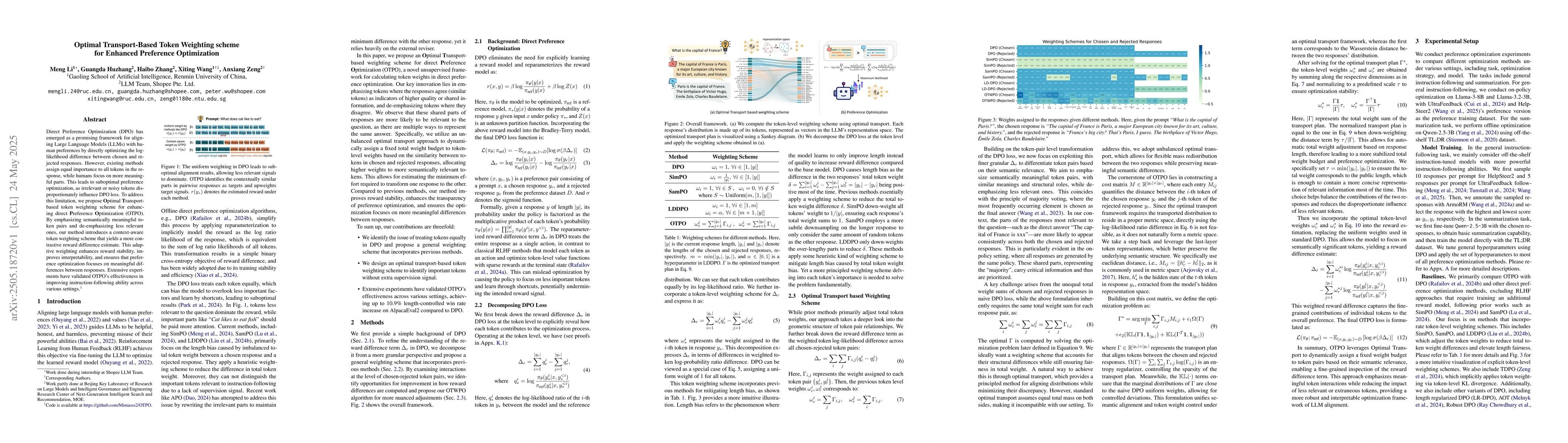 The research proposes OTPO, an Optimal Transport-based token weighting scheme to enhance Direct Preference Optimization (DPO) for aligning Large Language Models (LLMs) with human preferences. OTPO introduces a context-aware token weighting that emphasizes semantically meaningful tokens and de-emphasizes less relevant ones.