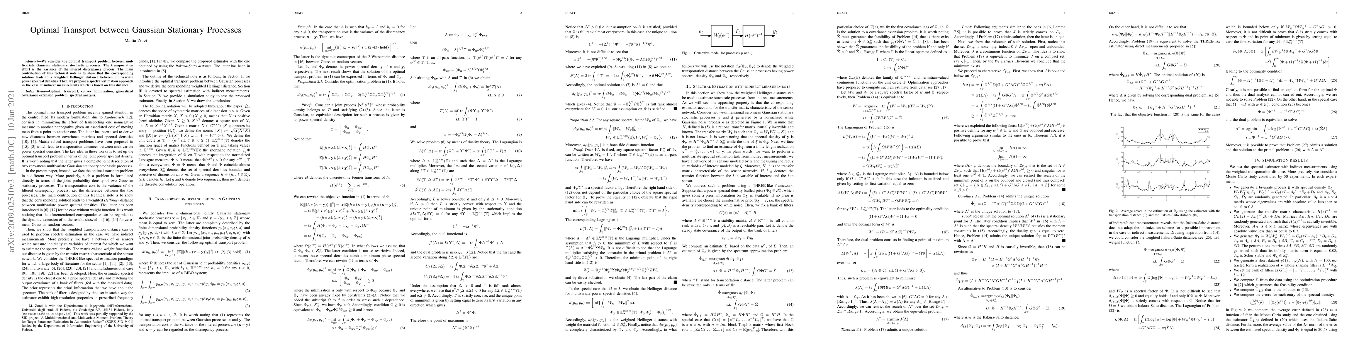 This paper addresses the optimal transport problem between multivariate Gaussian stationary stochastic processes, demonstrating that the solution corresponds to a weighted Hellinger distance between their power spectral densities. It also proposes a spectral estimation method for indirect measurements based on this distance.