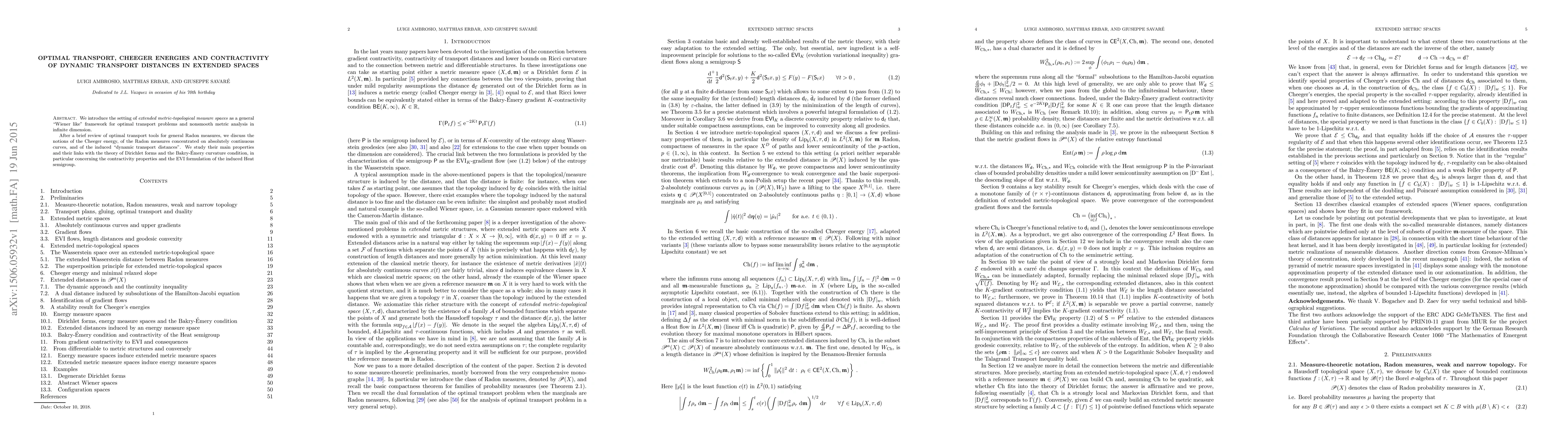 This paper introduces extended metric-topological measure spaces as a framework for optimal transport and nonsmooth metric analysis in infinite dimensions. It discusses Cheeger energies, dynamic transport distances, and their connections to Dirichlet forms and the Bakry-Émery curvature condition, focusing on the contractivity properties of the induced Heat semigroup.