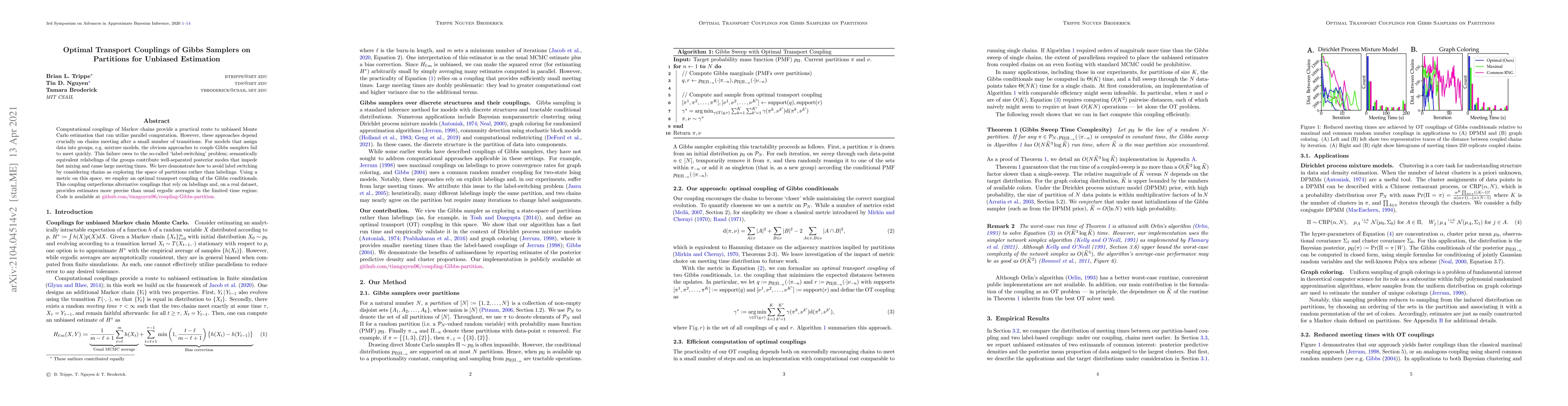 This paper proposes an optimal transport coupling of Gibbs samplers on partitions to address the label-switching problem in mixture models, achieving faster convergence and more precise unbiased estimates compared to traditional labeling-based couplings. The method leverages a metric on the space of partitions to avoid semantically equivalent relabelings.