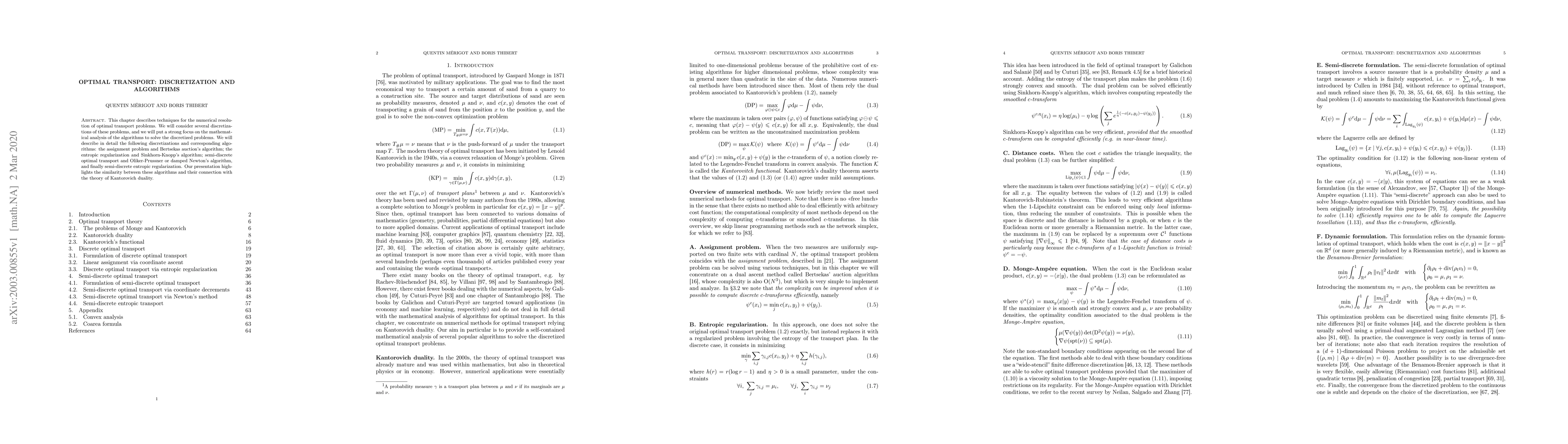 This paper explores numerical methods for optimal transport problems, focusing on various discretizations and their corresponding algorithms, including the assignment problem, entropic regularization, and semi-discrete optimal transport, with a particular emphasis on the mathematical analysis of these algorithms.