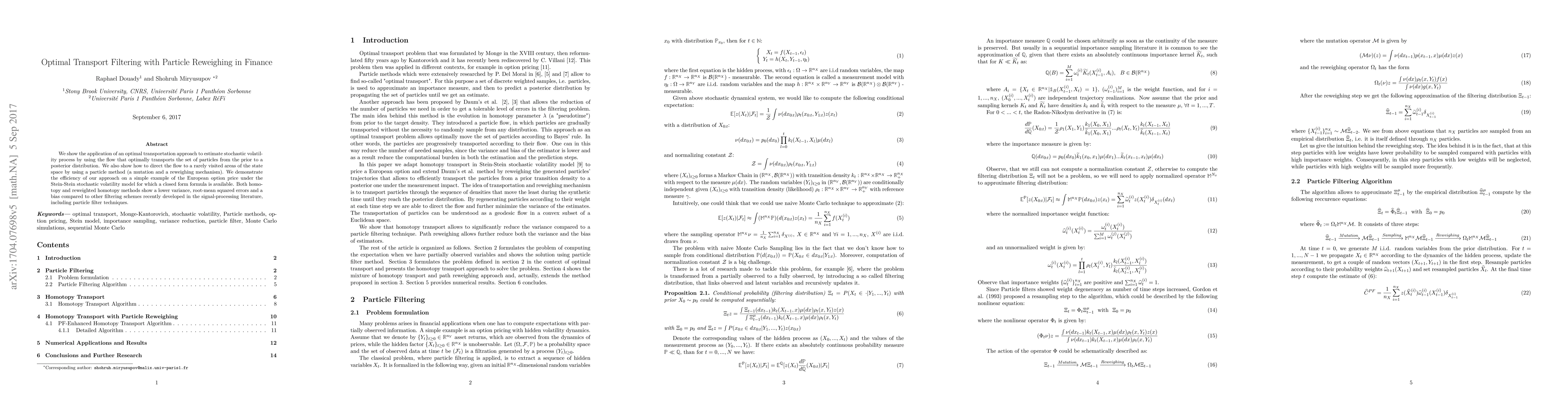 We show the application of an optimal transportation approach to estimate stochastic volatility process by using the flow that optimally transports the set of particles from the prior to a posterior distribution. We also show how to direct the flow to a rarely visited areas of the state space by using a particle method (a mutation and a reweighing mechanism). We demonstrate the efficiency of our approach on a simple example of the European option price under the Stein-Stein stochastic volatility model for which a closed form formula is available. Both homotopy and reweighted homotopy methods show a lower variance, root-mean squared errors and a bias compared to other filtering schemes recently developed in the signal-processing literature, including particle filter techniques.