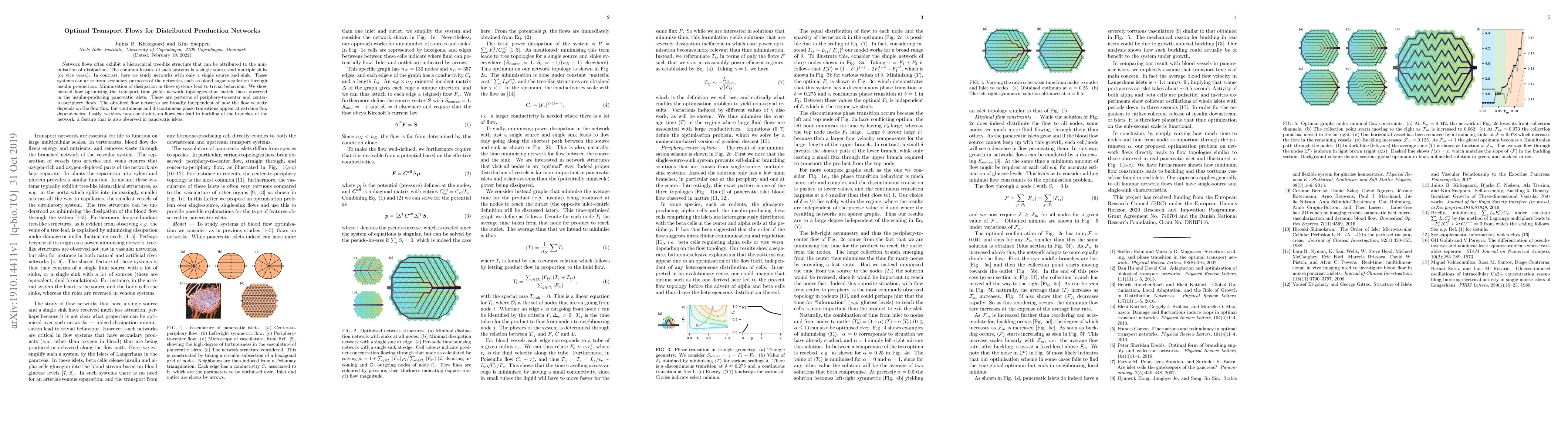 This research explores networks with a single source and sink, unlike traditional tree-like structures minimizing dissipation. By optimizing transport time, the study reveals network topologies similar to insulin-producing pancreatic islets, featuring periphery-to-center and center-to-periphery flows. These flow networks are robust to various flow velocity-flux dependencies, exhibiting phase transitions at extremes, and can buckle under flow constraints, mimicking observed pancreatic islet structures.
