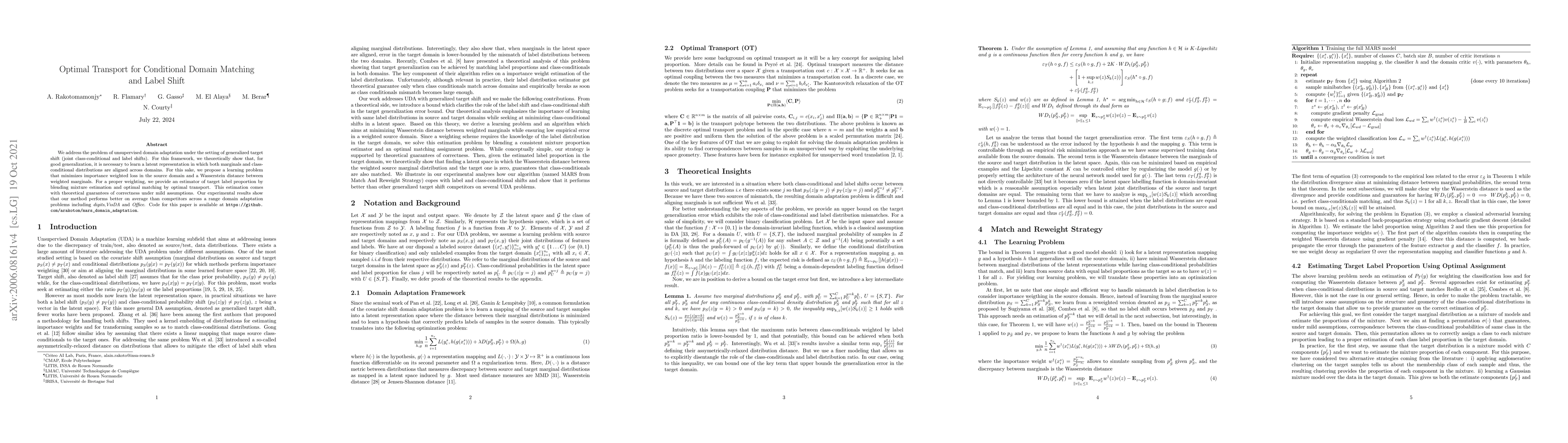 We address the problem of unsupervised domain adaptation under the setting of generalized target shift (joint class-conditional and label shifts). For this framework, we theoretically show that, for good generalization, it is necessary to learn a latent representation in which both marginals and class-conditional distributions are aligned across domains. For this sake, we propose a learning problem that minimizes importance weighted loss in the source domain and a Wasserstein distance between weighted marginals. For a proper weighting, we provide an estimator of target label proportion by blending mixture estimation and optimal matching by optimal transport. This estimation comes with theoretical guarantees of correctness under mild assumptions. Our experimental results show that our method performs better on average than competitors across a range domain adaptation problems including \emph{digits},\emph{VisDA} and \emph{Office}. Code for this paper is available at \url{https://github.com/arakotom/mars_domain_adaptation}.