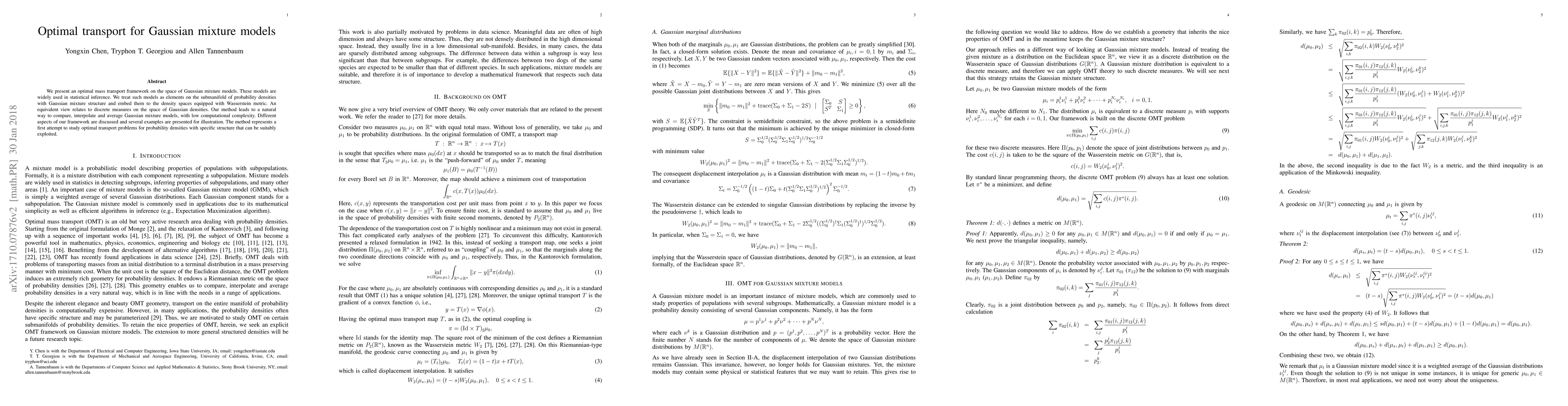 This paper introduces an optimal transport framework for comparing, interpolating, and averaging Gaussian mixture models, providing a structured approach to statistical inference. The method is demonstrated through examples on a submanifold of probability densities, marking an initial exploration into optimal transport for complex probability structures.