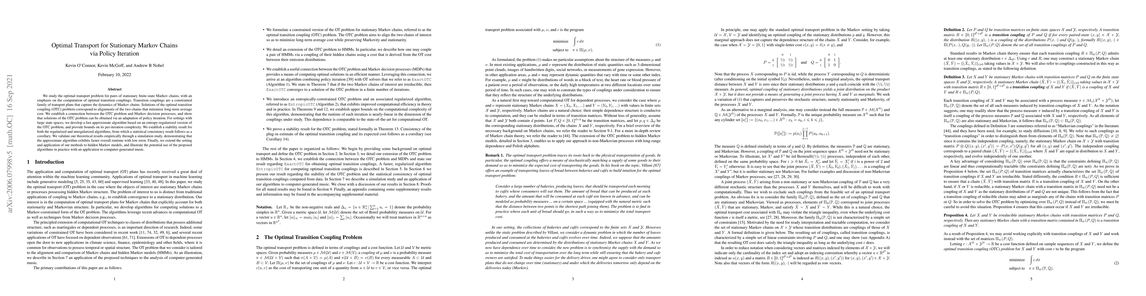 We study the optimal transport problem for pairs of stationary finite-state Markov chains, with an emphasis on the computation of optimal transition couplings. Transition couplings are a constrained family of transport plans that capture the dynamics of Markov chains. Solutions of the optimal transition coupling (OTC) problem correspond to alignments of the two chains that minimize long-term average cost. We establish a connection between the OTC problem and Markov decision processes, and show that solutions of the OTC problem can be obtained via an adaptation of policy iteration. For settings with large state spaces, we develop a fast approximate algorithm based on an entropy-regularized version of the OTC problem, and provide bounds on its per-iteration complexity. We establish a stability result for both the regularized and unregularized algorithms, from which a statistical consistency result follows as a corollary. We validate our theoretical results empirically through a simulation study, demonstrating that the approximate algorithm exhibits faster overall runtime with low error. Finally, we extend the setting and application of our methods to hidden Markov models, and illustrate the potential use of the proposed algorithms in practice with an application to computer-generated music.