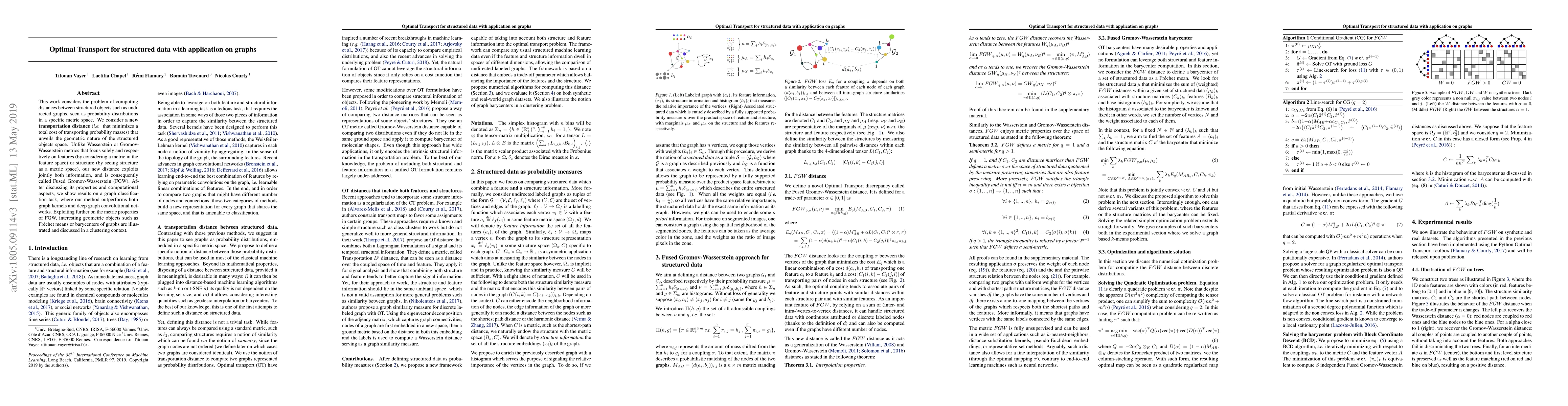 This paper introduces a new Fused Gromov-Wasserstein (FGW) distance for computing distances between undirected graphs, combining both feature and structural information. The method outperforms existing graph classification techniques and is applied to compute geometric objects like Fr\'echet means for clustering.