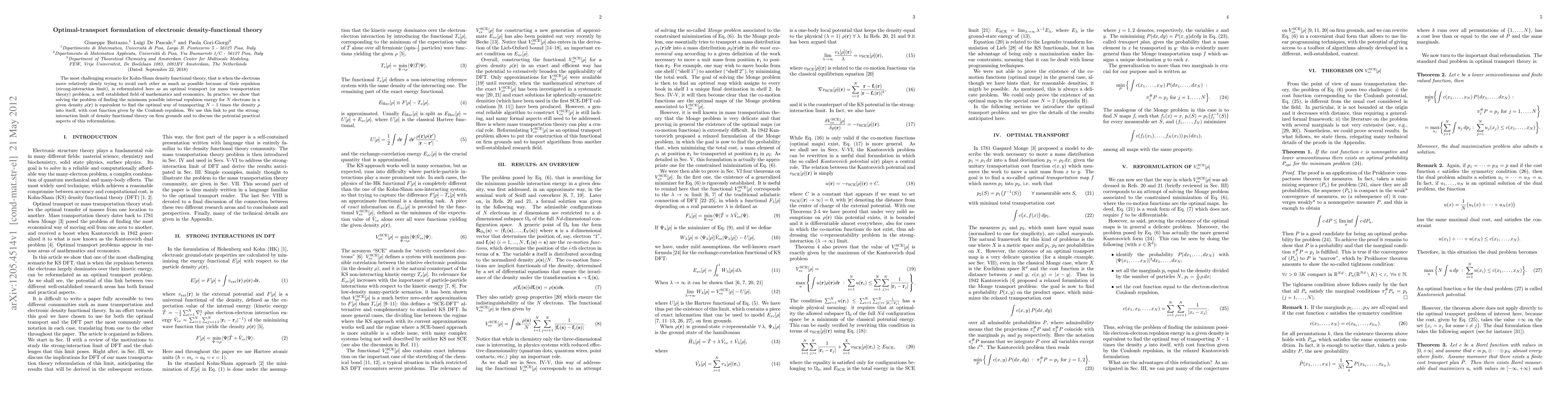 This paper reformulates the strong-interaction limit of Kohn-Sham density functional theory as an optimal transport problem, showing that minimizing internal repulsion energy for $N$ electrons is equivalent to finding the optimal way to transport $N-1$ times the electron density into itself, using Coulomb repulsion as the cost function. This mathematical reformulation provides a robust foundation for understanding the strong-interaction limit and its practical implications.