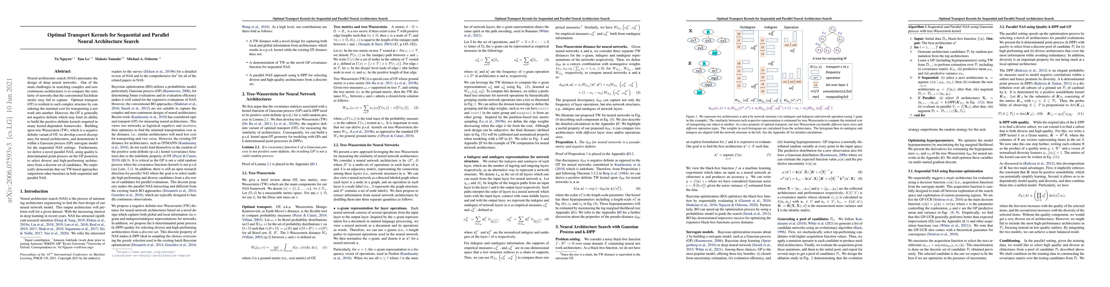 This paper develops a novel approach to neural architecture search using optimal transport kernels, outperforming traditional methods in both sequential and parallel NAS settings.