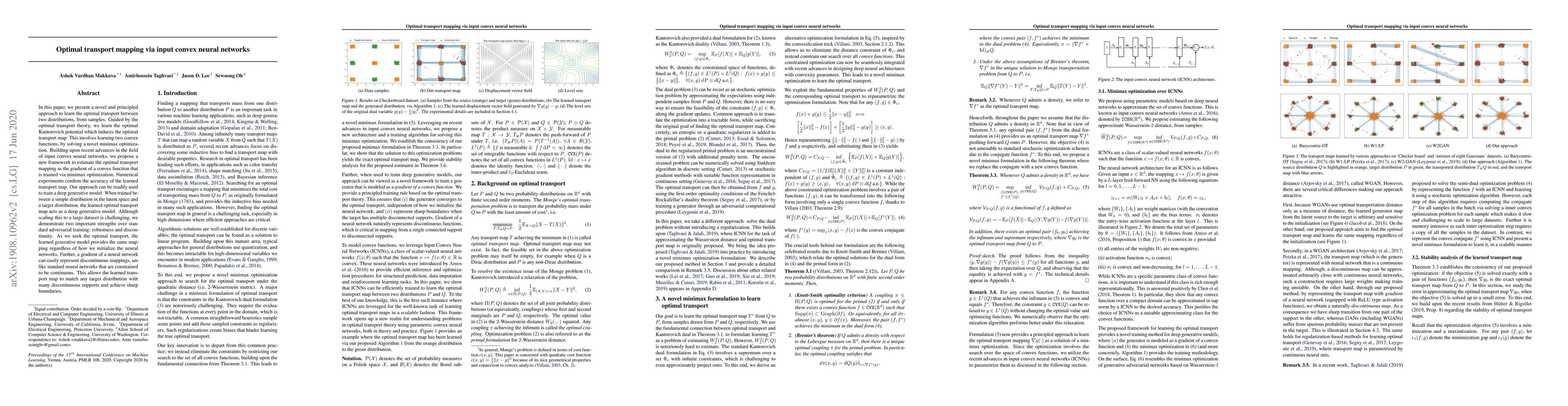 This paper introduces a novel framework using input convex neural networks to learn the optimal transport map between two distributions. It leverages optimal transport theory to solve a minimax optimization for learning two convex functions, ensuring the transport mapping is optimal and can handle discontinuous target distributions.