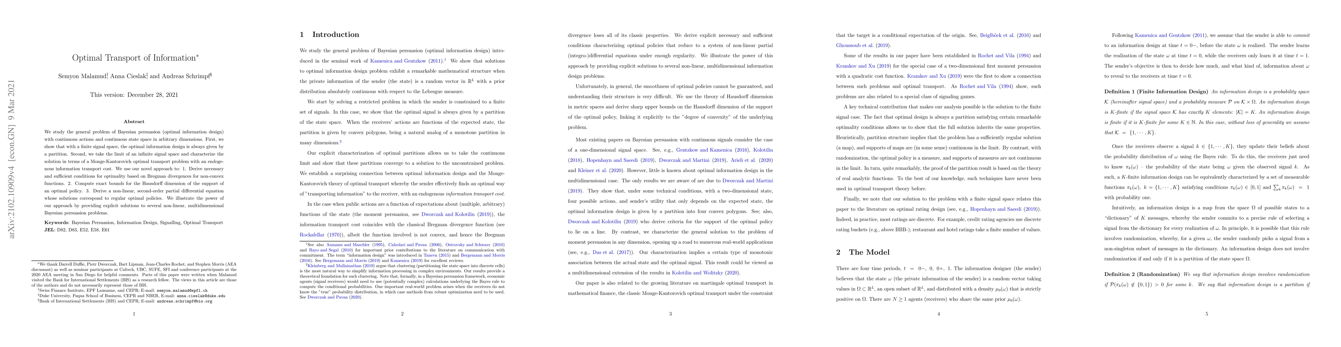 We study the general problem of Bayesian persuasion (optimal information design) with continuous actions and continuous state space in arbitrary dimensions. First, we show that with a finite signal space, the optimal information design is always given by a partition. Second, we take the limit of an infinite signal space and characterize the solution in terms of a Monge-Kantorovich optimal transport problem with an endogenous information transport cost. We use our novel approach to: 1. Derive necessary and sufficient conditions for optimality based on Bregman divergences for non-convex functions. 2. Compute exact bounds for the Hausdorff dimension of the support of an optimal policy. 3. Derive a non-linear, second-order partial differential equation whose solutions correspond to regular optimal policies. We illustrate the power of our approach by providing explicit solutions to several non-linear, multidimensional Bayesian persuasion problems.