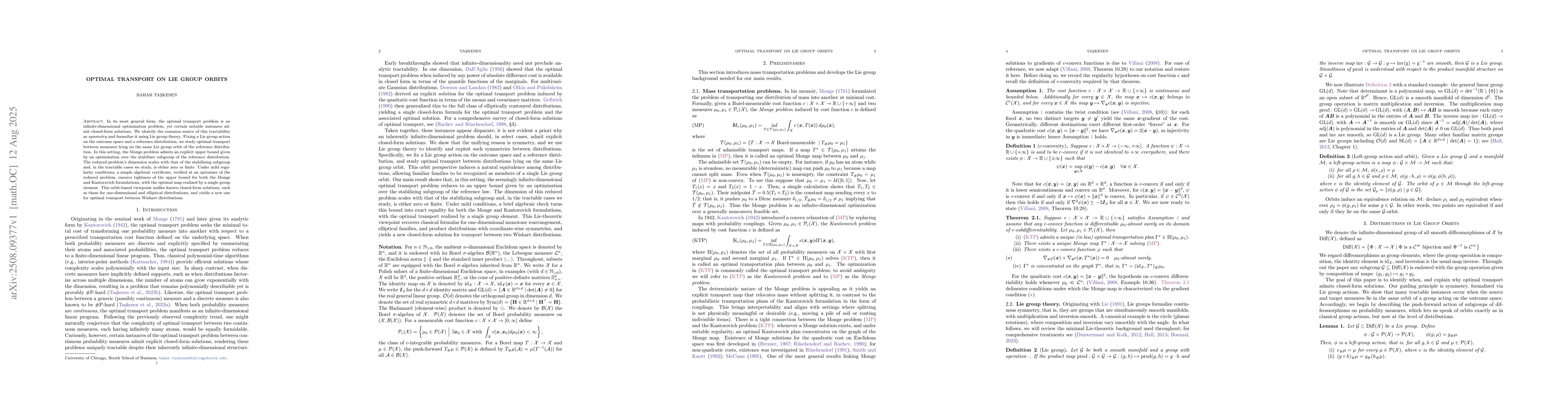 In its most general form, the optimal transport problem is an infinite-dimensional optimization problem, yet certain notable instances admit closed-form solutions. We identify the common source of this tractability as symmetry and formalize it using Lie group theory. Fixing a Lie group action on the outcome space and a reference distribution, we study optimal transport between measures lying on the same Lie group orbit of the reference distribution. In this setting, the Monge problem admits an explicit upper bound given by an optimization over the stabilizer subgroup of the reference distribution. The reduced problem's dimension scales with that of the stabilizing subgroup and, in the tractable cases we study, is either zero or finite. Under mild regularity conditions, a simple algebraic certificate, verified at an optimizer of the reduced problem, ensures tightness of the upper bound for both the Monge and Kantorovich formulations, with the optimal map realized by a single group element. This orbit-based viewpoint unifies known closed-form solutions, such as those for one-dimensional and elliptical distributions, and yields a new one for optimal transport between Wishart distributions.