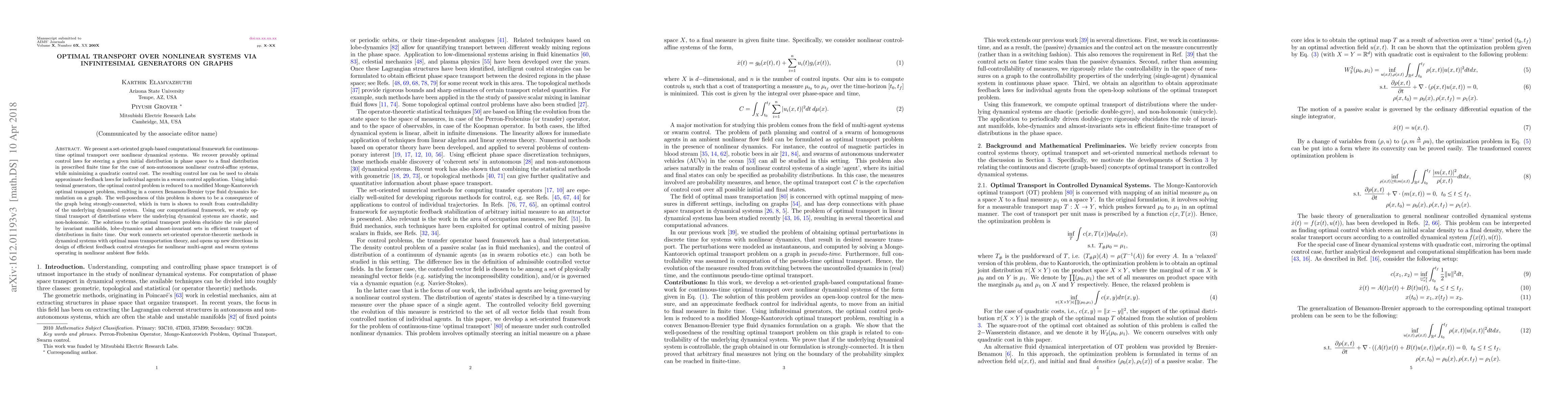 This paper introduces a graph-based computational framework for optimal transport over nonlinear dynamical systems, deriving optimal control laws via infinitesimal generators. It connects operator-theoretic methods with optimal mass transportation theory to design efficient feedback control strategies for swarm systems.