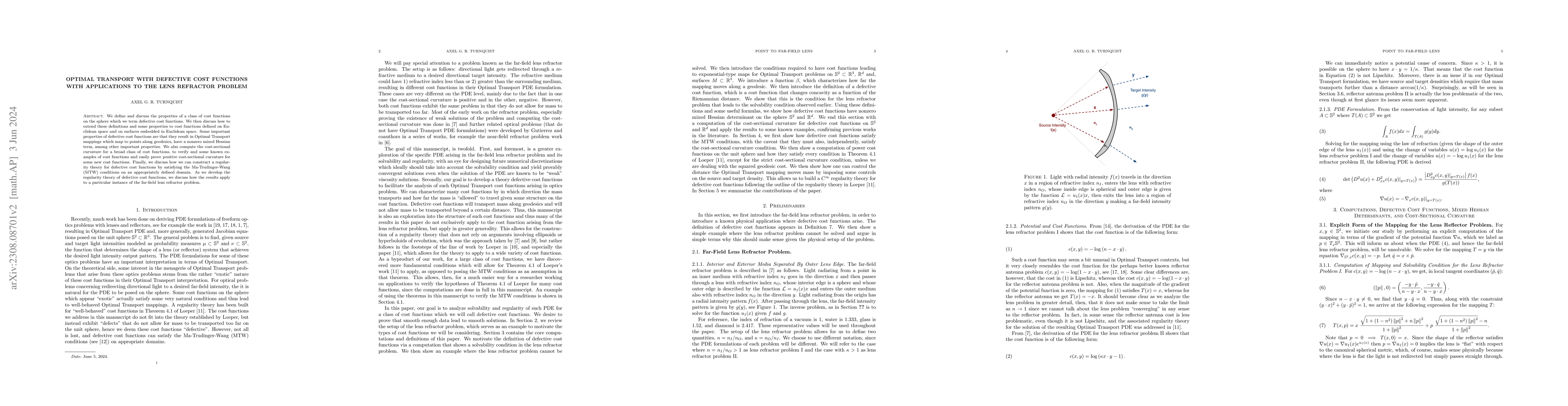 This paper introduces defective cost functions and their properties, extending them to Euclidean space and embedded surfaces. It explores how these functions yield optimal transport mappings along geodesics and proves positive cost-sectional curvature for new functions, while discussing applications to the lens refractor problem and developing a regularity theory based on MTW conditions.