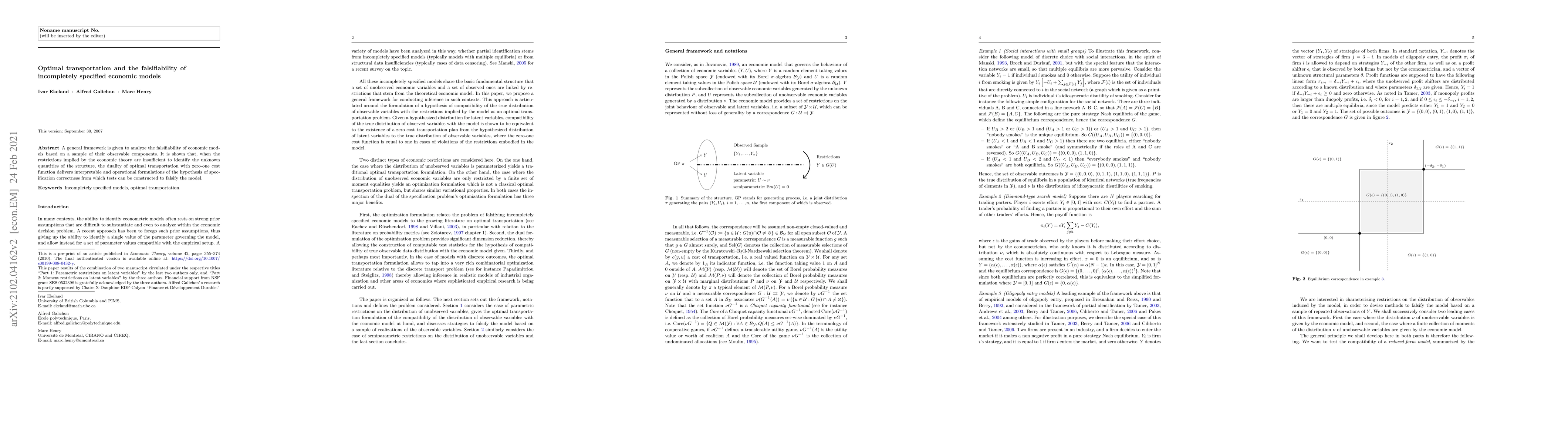 A general framework is given to analyze the falsifiability of economic models based on a sample of their observable components. It is shown that, when the restrictions implied by the economic theory are insufficient to identify the unknown quantities of the structure, the duality of optimal transportation with zero-one cost function delivers interpretable and operational formulations of the hypothesis of specification correctness from which tests can be constructed to falsify the model.