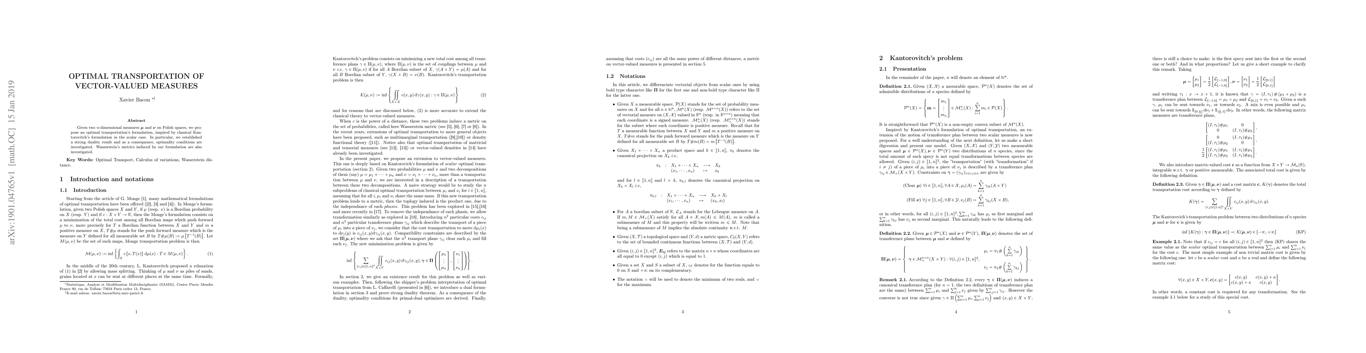 Given two n-dimensional measures $\mu$ and $\nu$ on Polish spaces, we propose an optimal transportation's formulation, inspired by classical Kan-torovitch's formulation in the scalar case. In particular, we established a strong duality result and as a consequence, optimality conditions are investigated. Wasserstein's metrics induced by our formulation are also investigated.