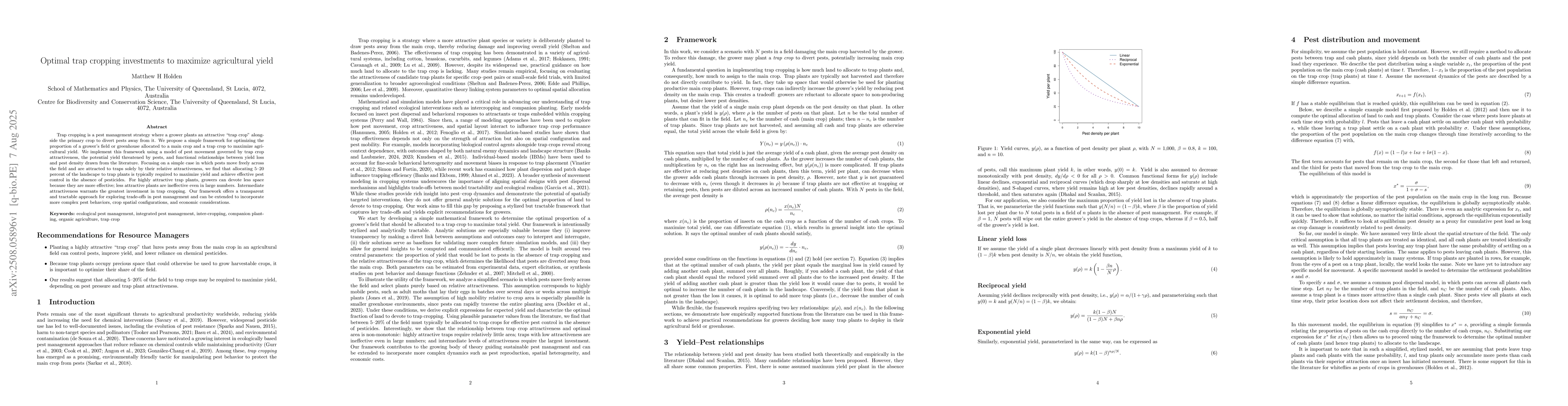 Trap cropping is a pest management strategy where a grower plants an attractive "trap crop" alongside the primary crop to divert pests away from it. We propose a simple framework for optimizing the proportion of a grower's field or greenhouse allocated to a main crop and a trap crop to maximize agricultural yield. We implement this framework using a model of pest movement governed by trap crop attractiveness, the potential yield threatened by pests, and functional relationships between yield loss and pest density drawn from the literature. Focusing on a simple case in which pests move freely across the field and are attracted to traps solely by their relative attractiveness, we find that allocating 5-20 percent of the landscape to trap plants is typically required to maximize yield and achieve effective pest control in the absence of pesticides. For highly attractive trap plants, growers can devote less space because they are more effective; less attractive plants are ineffective even in large numbers. Intermediate attractiveness warrants the greatest investment in trap cropping. Our framework offers a transparent and tractable approach for exploring trade-offs in pest management and can be extended to incorporate more complex pest behaviors, crop spatial configurations, and economic considerations.