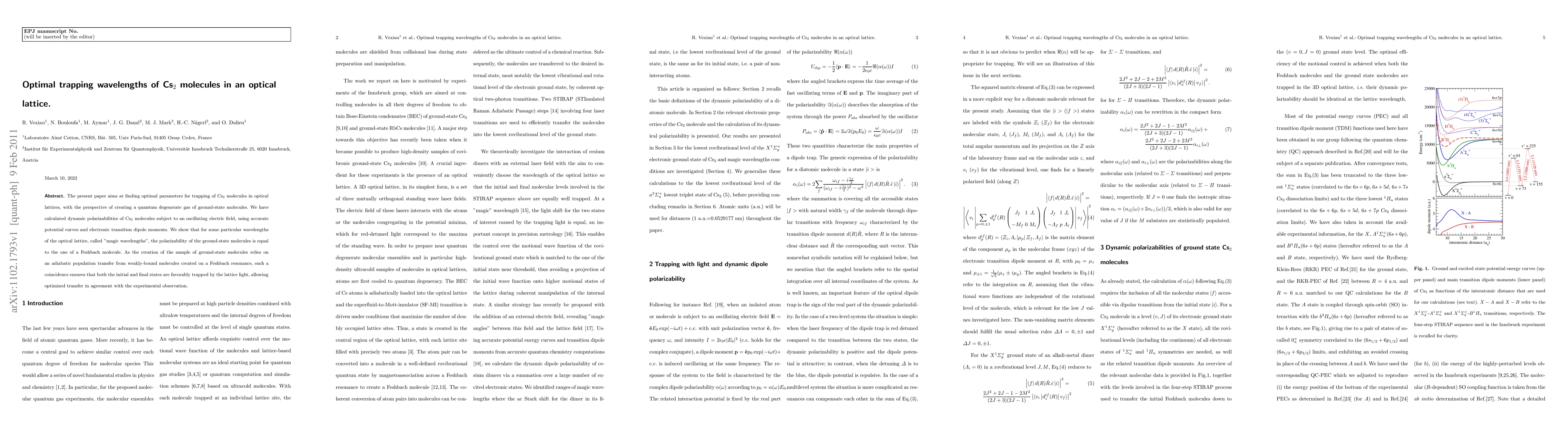 This paper identifies optimal trapping wavelengths for Cs$_2$ molecules in optical lattices, termed "magic wavelengths," where the dynamic polarizability matches that of a Feshbach molecule, facilitating efficient adiabatic population transfer and creation of a quantum degenerate gas of ground-state molecules.