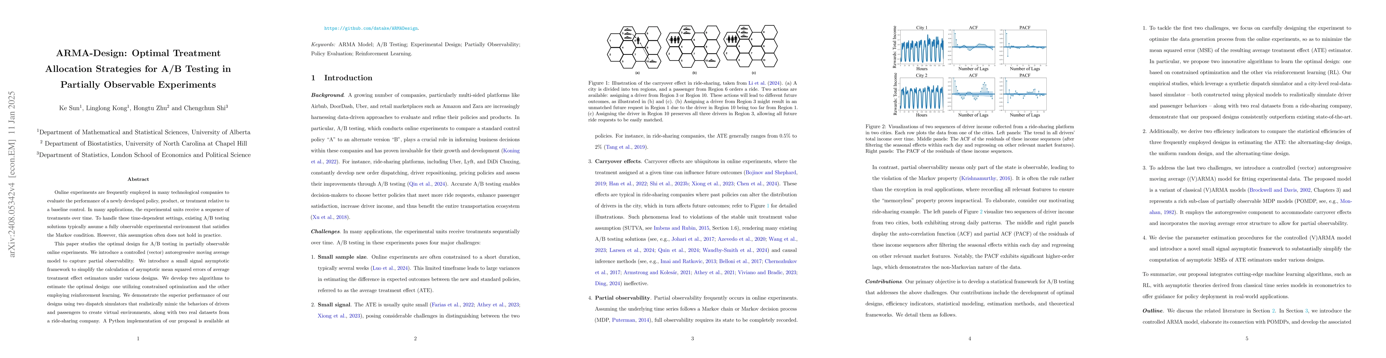 This paper proposes optimal treatment allocation strategies for A/B testing in partially observable time series experiments, introducing a controlled ARMA model and developing algorithms for optimal design using constrained optimization and reinforcement learning. The proposed methods outperform existing approaches, demonstrated via a dispatch simulator and real-world datasets from a ride-sharing company.