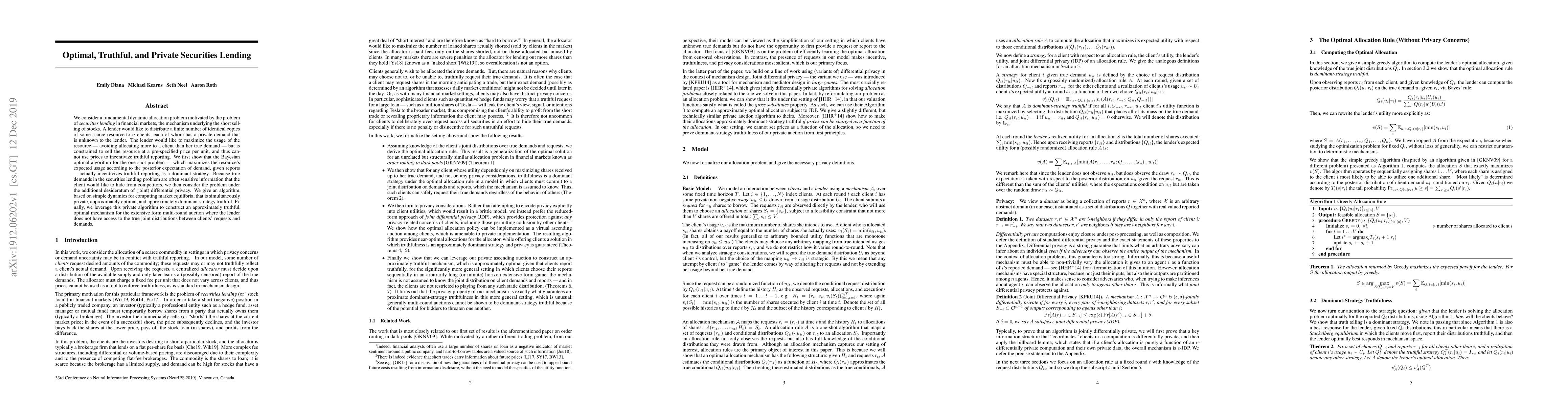 Researchers develop an algorithm to optimize securities lending while ensuring truthful reporting and differential privacy, addressing a challenge in financial markets where lenders aim to allocate scarce resources without revealing clients' private demands.
