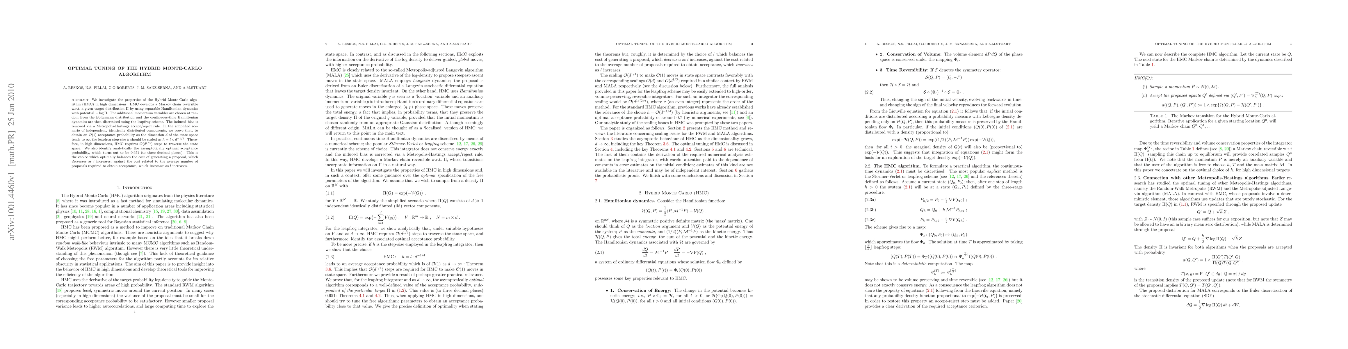 The Hybrid Monte-Carlo algorithm's performance in high dimensions is improved by scaling its step-size with the square root of the dimensionality, leading to an optimal acceptance probability of 0.651.