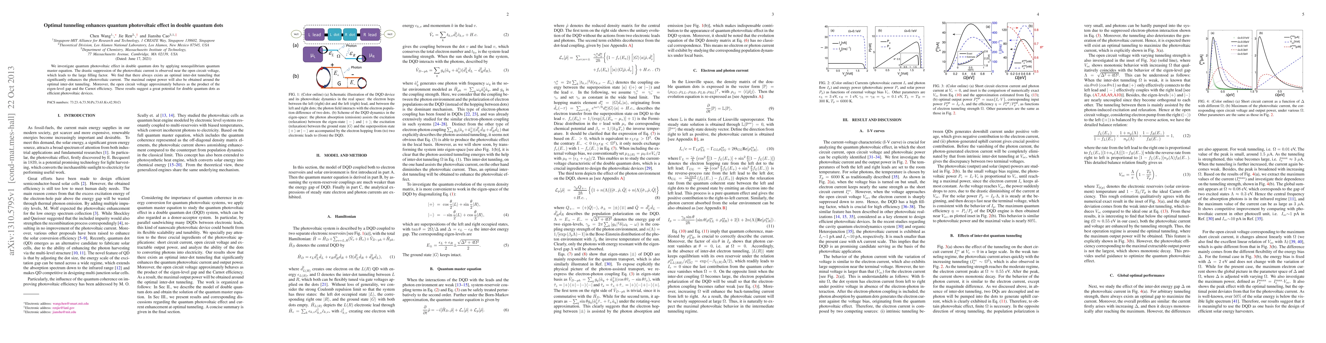 This study reveals that optimal inter-dot tunneling significantly enhances the quantum photovoltaic effect in double quantum dots, leading to maximal output power and a large filling factor. The open circuit voltage correlates with the eigen-level gap and Carnot efficiency, indicating promising potential for double quantum dots in photovoltaic applications.