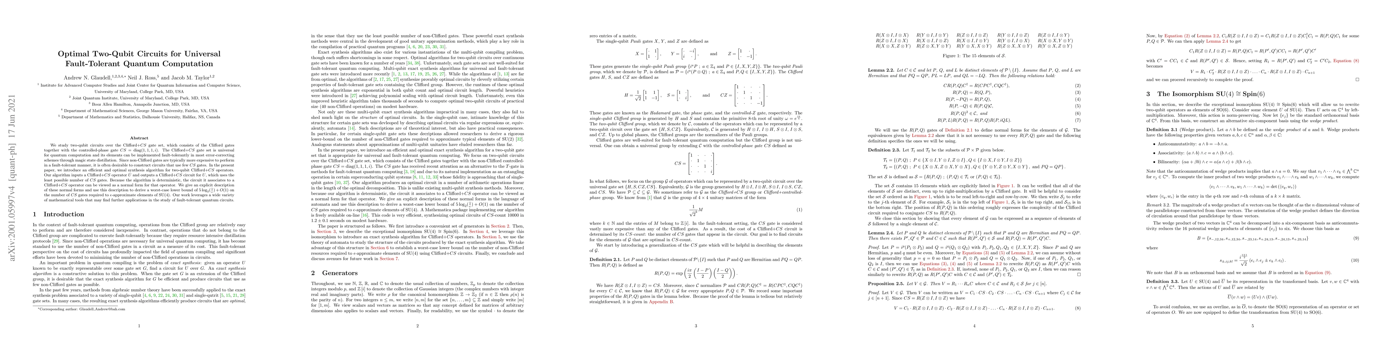 We study two-qubit circuits over the Clifford+CS gate set, which consists of the Clifford gates together with the controlled-phase gate CS=diag(1,1,1,i). The Clifford+CS gate set is universal for quantum computation and its elements can be implemented fault-tolerantly in most error-correcting schemes through magic state distillation. Since non-Clifford gates are typically more expensive to perform in a fault-tolerant manner, it is often desirable to construct circuits that use few CS gates. In the present paper, we introduce an efficient and optimal synthesis algorithm for two-qubit Clifford+CS operators. Our algorithm inputs a Clifford+CS operator U and outputs a Clifford+CS circuit for U, which uses the least possible number of CS gates. Because the algorithm is deterministic, the circuit it associates to a Clifford+CS operator can be viewed as a normal form for that operator. We give an explicit description of these normal forms and use this description to derive a worst-case lower bound of 5log(1/epsilon)+O(1) on the number of CS gates required to epsilon-approximate elements of SU(4). Our work leverages a wide variety of mathematical tools that may find further applications in the study of fault-tolerant quantum circuits.