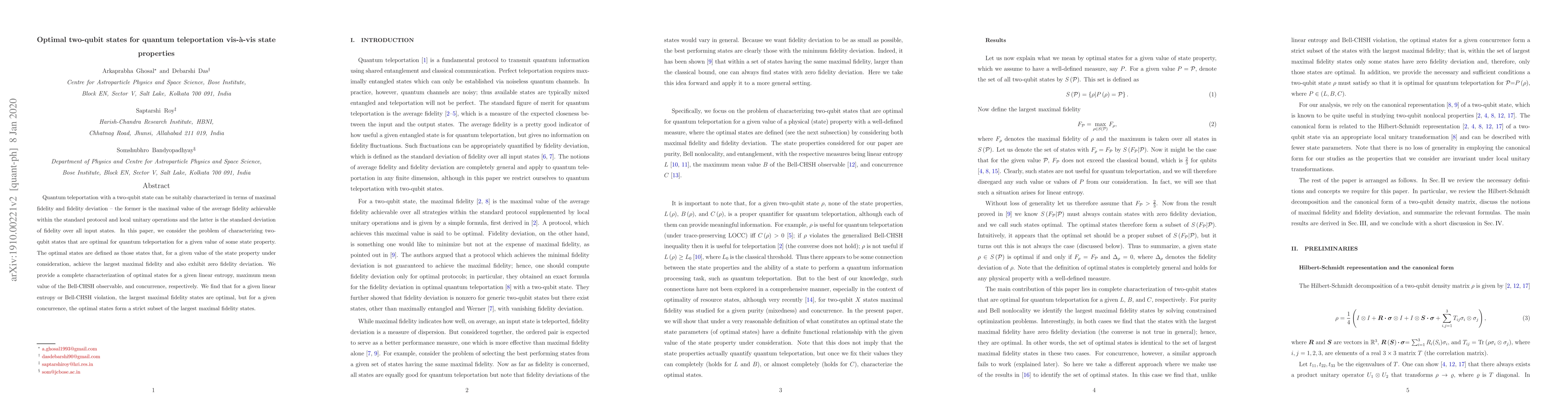 This paper characterizes optimal two-qubit states for quantum teleportation based on maximal fidelity and fidelity deviation, identifying states that achieve the highest fidelity for given properties like linear entropy, Bell-CHSH violation, and concurrence. It finds that for linear entropy and Bell-CHSH violation, the states with the largest maximal fidelity are optimal, but for concurrence, the optimal states are a subset of these.