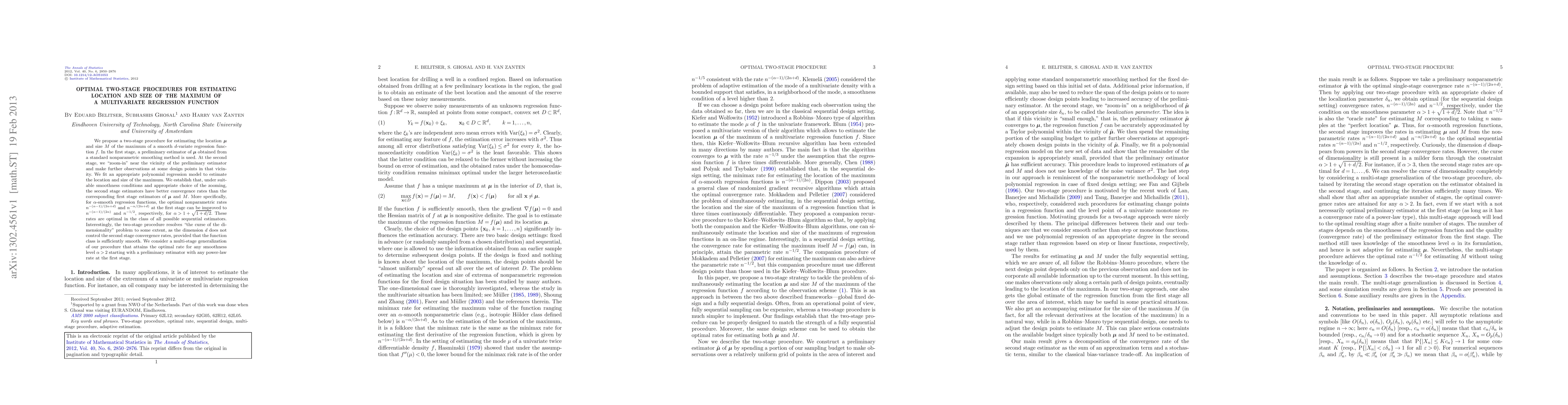 We propose a two-stage procedure for estimating the location $\bolds{\mu}$ and size M of the maximum of a smooth d-variate regression function f. In the first stage, a preliminary estimator of $\bolds{\mu}$ obtained from a standard nonparametric smoothing method is used. At the second stage, we "zoom-in" near the vicinity of the preliminary estimator and make further observations at some design points in that vicinity. We fit an appropriate polynomial regression model to estimate the location and size of the maximum. We establish that, under suitable smoothness conditions and appropriate choice of the zooming, the second stage estimators have better convergence rates than the corresponding first stage estimators of $\bolds{\mu}$ and M. More specifically, for $\alpha$-smooth regression functions, the optimal nonparametric rates $n^{-(\alpha-1)/(2\alpha+d)}$ and $n^{-\alpha/(2\alpha+d)}$ at the first stage can be improved to $n^{-(\alpha-1)/(2\alpha)}$ and $n^{-1/2}$, respectively, for $\alpha>1+\sqrt{1+d/2}$. These rates are optimal in the class of all possible sequential estimators. Interestingly, the two-stage procedure resolves "the curse of the dimensionality" problem to some extent, as the dimension d does not control the second stage convergence rates, provided that the function class is sufficiently smooth. We consider a multi-stage generalization of our procedure that attains the optimal rate for any smoothness level $\alpha>2$ starting with a preliminary estimator with any power-law rate at the first stage.