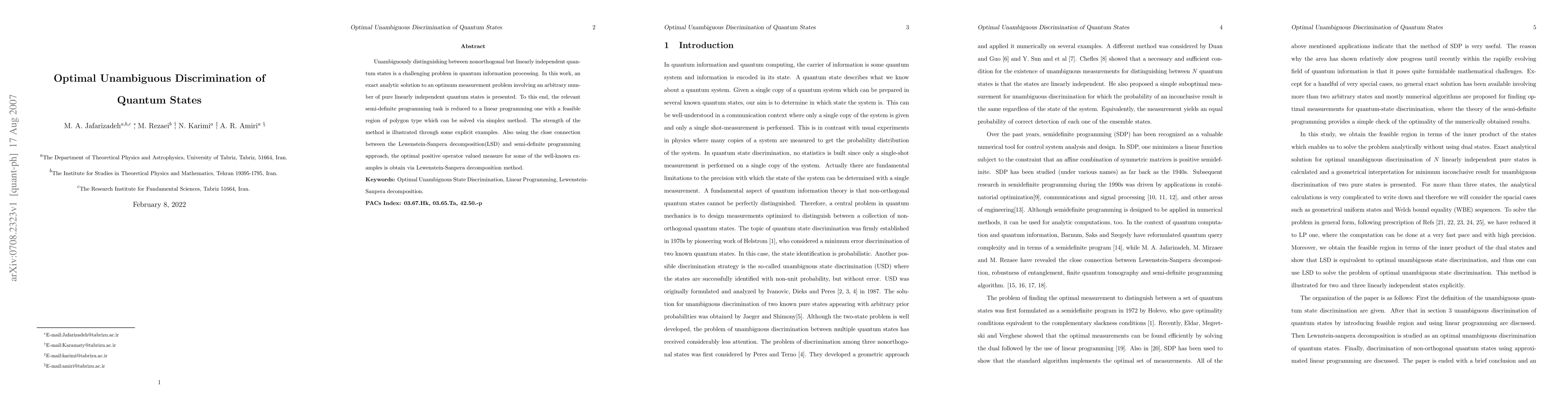 Unambiguously distinguishing between nonorthogonal but linearly independent quantum states is a challenging problem in quantum information processing. In this work, an exact analytic solution to an optimum measurement problem involving an arbitrary number of pure linearly independent quantum states is presented. To this end, the relevant semi-definite programming task is reduced to a linear programming one with a feasible region of polygon type which can be solved via simplex method. The strength of the method is illustrated through some explicit examples. Also using the close connection between the Lewenstein-Sanpera decomposition(LSD) and semi-definite programming approach, the optimal positive operator valued measure for some of the well-known examples is obtain via Lewenstein-Sanpera decomposition method. {\bf Keywords:} Optimal Unambiguous State Discrimination, Linear Programming, Lewenstein-Sanpera decomposition. {\bf PACs Index: 03.67.Hk, 03.65.Ta, 42.50.-p
