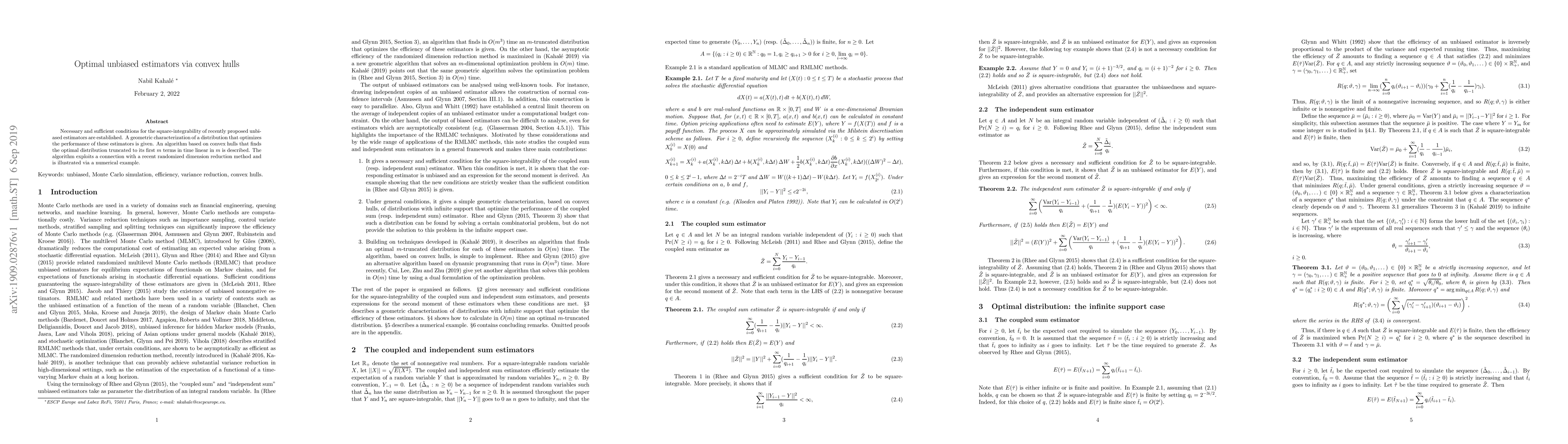 This paper establishes conditions for the square-integrability of unbiased estimators and characterizes a distribution that optimizes their performance. It introduces an algorithm based on convex hulls to find the optimal distribution truncated to its first m terms in linear time, leveraging a connection with a randomized dimension reduction method.