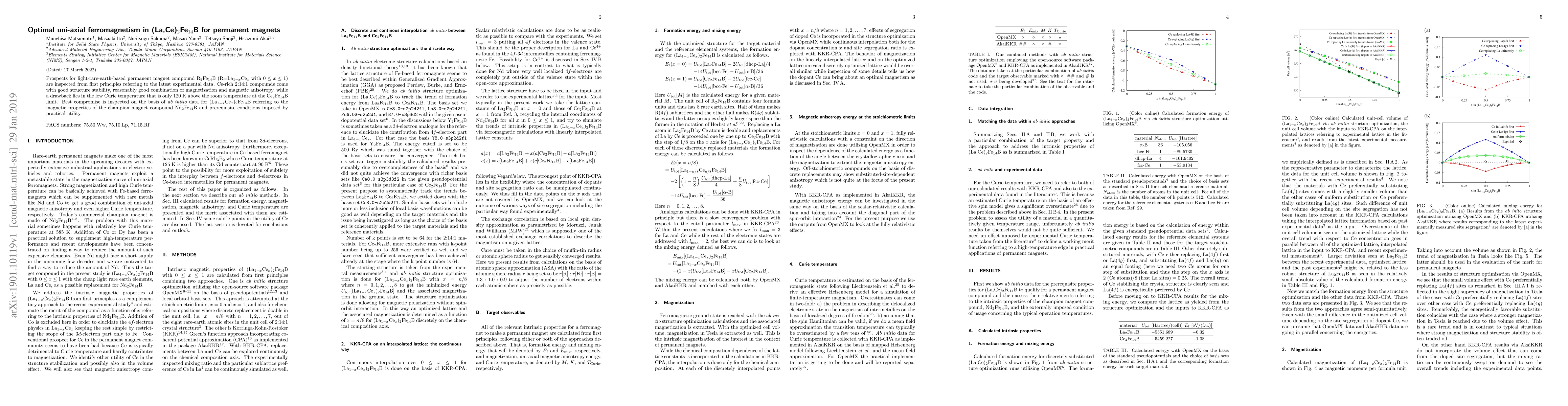 Prospects for light-rare-earth-based permanent magnet compound R$_{2}$Fe$_{14}$B (R=La$_{1-x}$Ce$_{x}$ with $0 \le x\le 1$) are inspected from first principles referring to the latest experimental data. Ce-rich 2:14:1 compounds come with good structure stability, reasonably good combination of magnetization and magnetic anisotropy, while a drawback lies in the low Curie temperature that is only 120~K above the room temperature at the Ce$_2$Fe$_{14}$B limit. Best compromise is inspected on the basis of ab initio data for (La$_{1-x}$Ce$_{x}$)$_2$Fe$_{14}$B referring to the magnetic properties of the champion magnet compound Nd$_{2}$Fe$_{14}$B and prerequisite conditions imposed by practical utility.