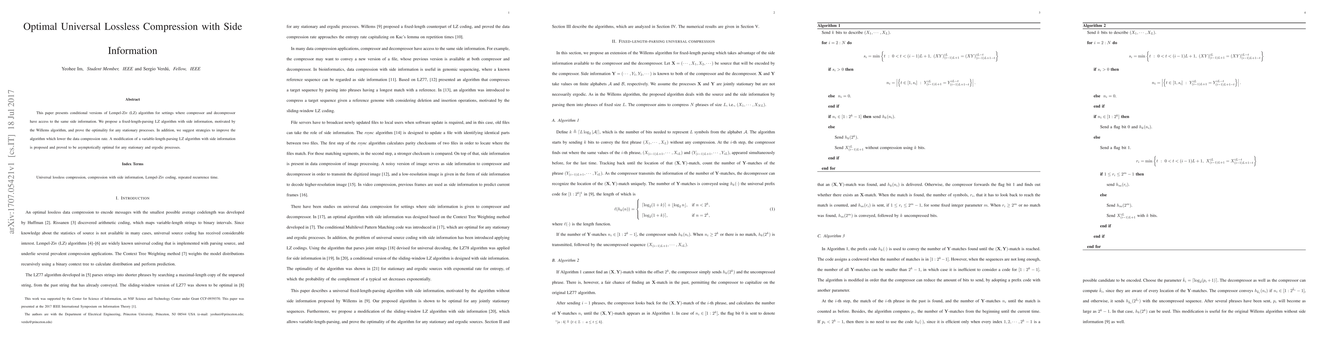 This paper presents conditional versions of Lempel-Ziv (LZ) algorithm for settings where compressor and decompressor have access to the same side information. We propose a fixed-length-parsing LZ algorithm with side information, motivated by the Willems algorithm, and prove the optimality for any stationary processes. In addition, we suggest strategies to improve the algorithm which lower the data compression rate. A modification of a variable-length-parsing LZ algorithm with side information is proposed and proved to be asymptotically optimal for any stationary and ergodic processes.