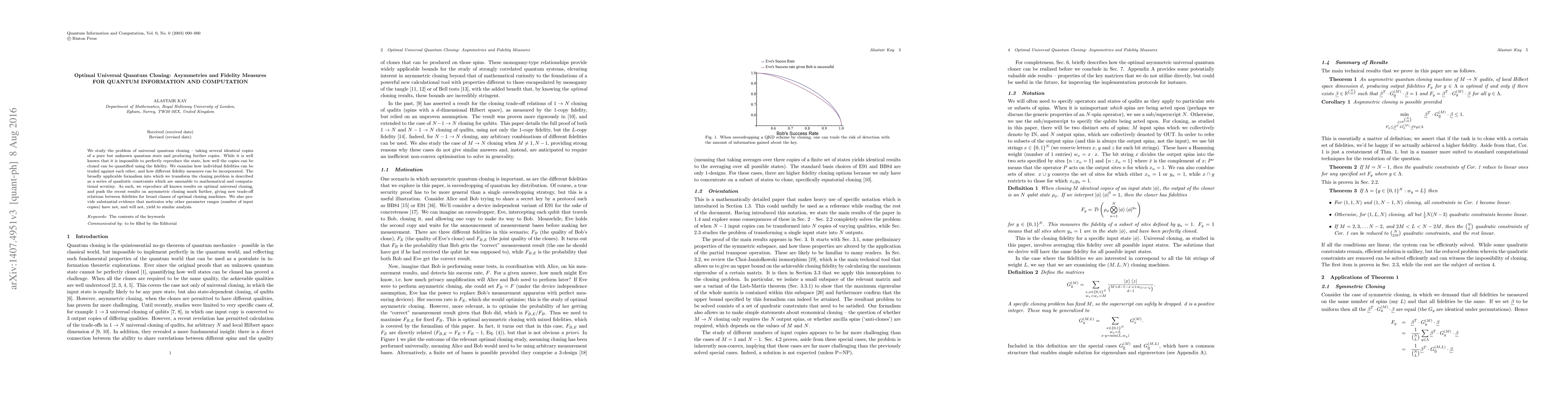 This paper investigates optimal universal quantum cloning, focusing on the trade-offs between different fidelities and the mathematical framework for analyzing these trade-offs. It extends recent results on asymmetric cloning and provides new insights into the limits of such analyses for different input copy numbers.