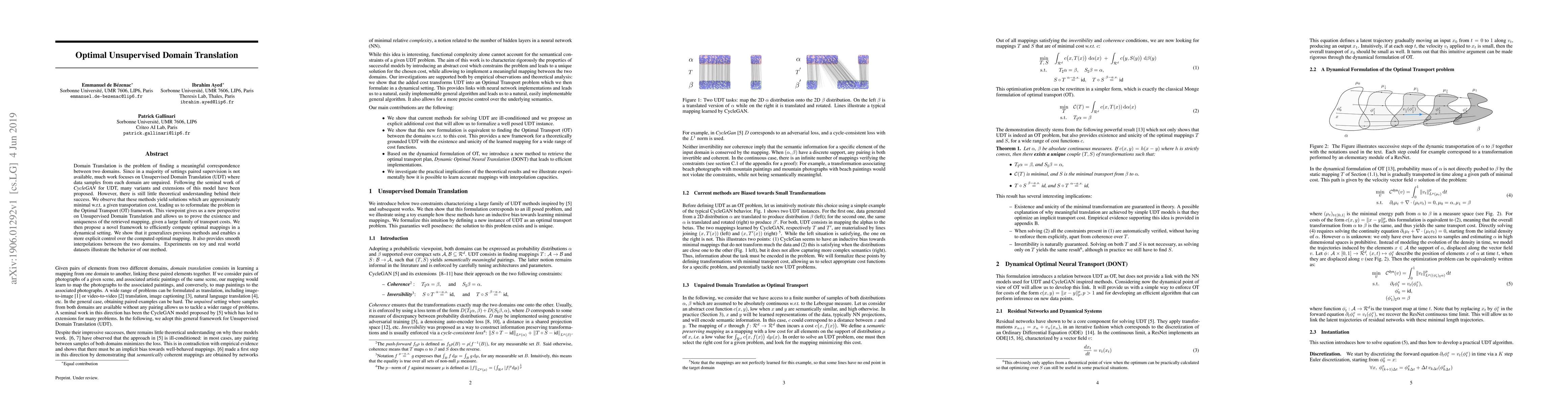 This paper reformulates Unsupervised Domain Translation within the Optimal Transport framework, proving the existence and uniqueness of the retrieved mapping. It proposes a novel framework to efficiently compute optimal mappings, generalizing previous methods and enabling explicit control over the mapping and smooth interpolations between domains, as demonstrated through experiments.