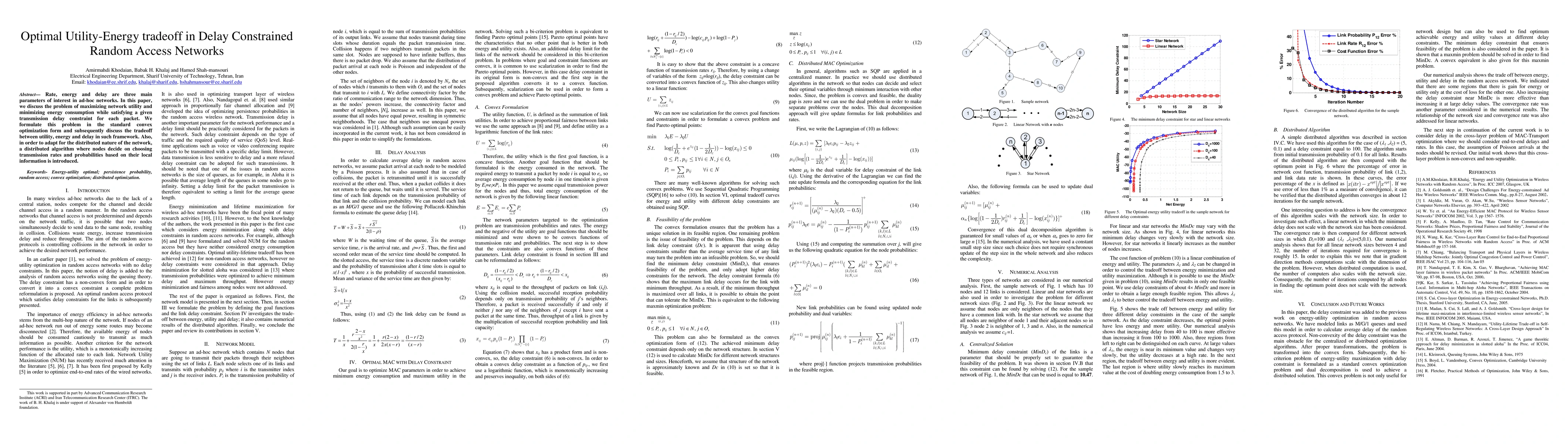 This paper addresses the challenge of optimizing network utility and minimizing energy consumption in delay-constrained random access networks, formulating a convex optimization problem. It introduces a distributed algorithm enabling nodes to make local decisions on transmission rates and probabilities to balance utility, energy, and delay.