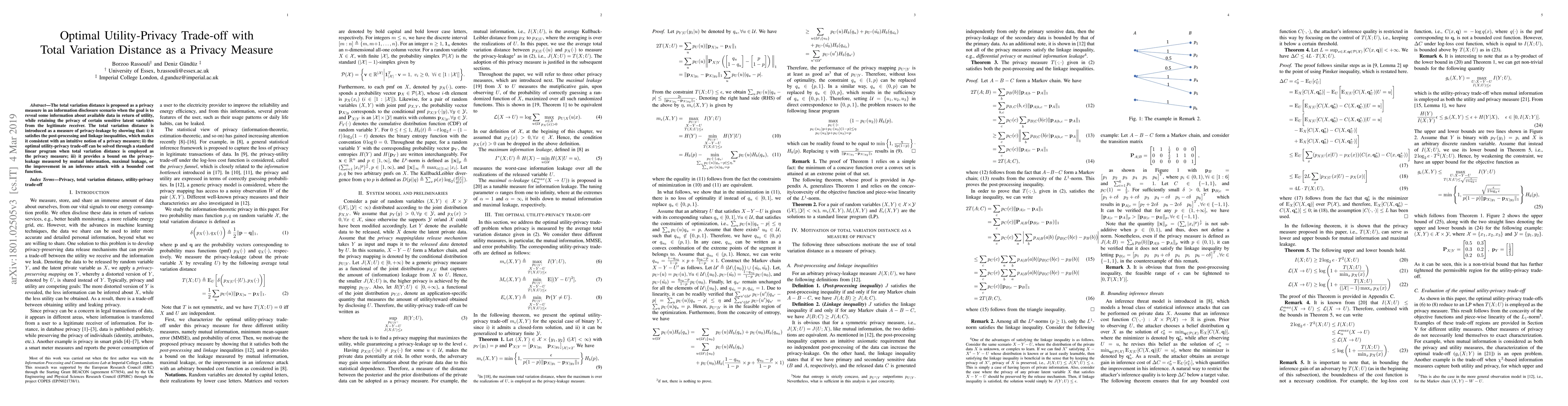 This paper introduces the total variation distance as a privacy measure to balance utility and privacy in data disclosure. It demonstrates that this measure satisfies important privacy properties and can be used to solve the optimal utility-privacy trade-off via a linear program, while also providing bounds on privacy leakage compared to other metrics.