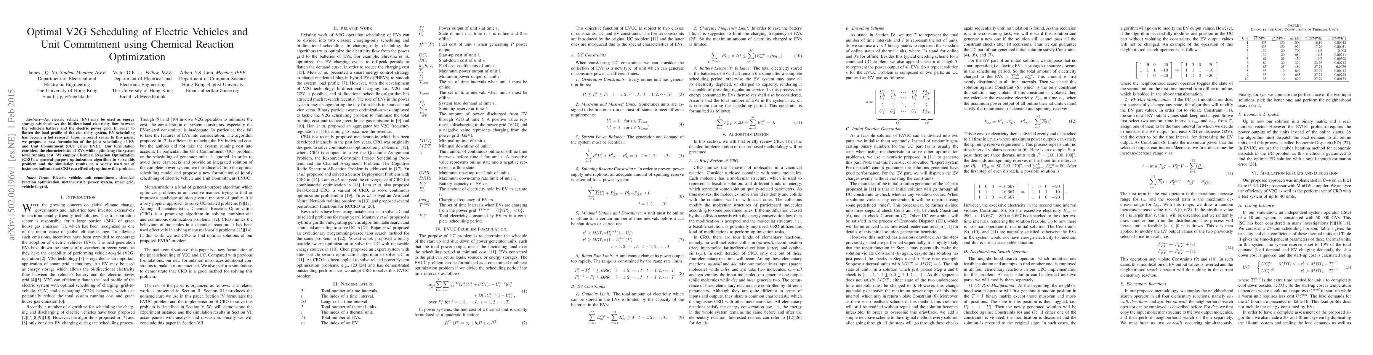 An electric vehicle (EV) may be used as energy storage which allows the bi-directional electricity flow between the vehicle's battery and the electric power grid. In order to flatten the load profile of the electricity system, EV scheduling has become a hot research topic in recent years. In this paper, we propose a new formulation of the joint scheduling of EV and Unit Commitment (UC), called EVUC. Our formulation considers the characteristics of EVs while optimizing the system total running cost. We employ Chemical Reaction Optimization (CRO), a general-purpose optimization algorithm to solve this problem and the simulation results on a widely used set of instances indicate that CRO can effectively optimize this problem.