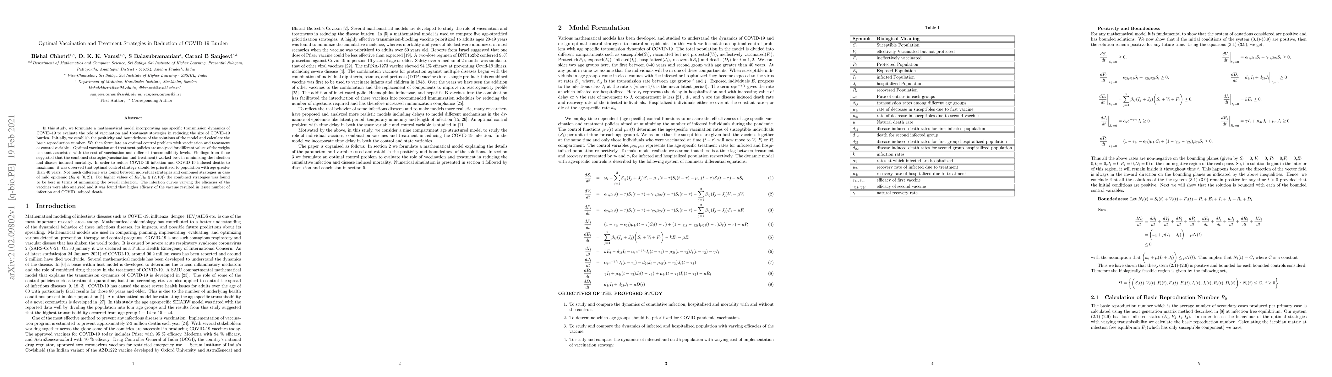 In this study, we formulate a mathematical model incorporating age specific transmission dynamics of COVID-19 to evaluate the role of vaccination and treatment strategies in reducing the size of COVID-19 burden. Initially, we establish the positivity and boundedness of the solutions of the model and calculate the basic reproduction number. We then formulate an optimal control problem with vaccination and treatment as control variables. Optimal vaccination and treatment policies are analysed for different values of the weight constant associated with the cost of vaccination and different transmissibility levels. Findings from these suggested that the combined strategies(vaccination and treatment) worked best in minimizing the infection and disease induced mortality. In order to reduce COVID-19 infection and COVID-19 induced deaths to maximum, it was observed that optimal control strategy should be prioritized to population with age greater than 40 years. Not much difference was found between individual strategies and combined strategies in case of mild epidemic ($R_0 \in (0, 2)$). For higher values of $R_0 (R_0 \in (2, 10))$ the combined strategies was found to be best in terms of minimizing the overall infection. The infection curves varying the efficacies of the vaccines were also analysed and it was found that higher efficacy of the vaccine resulted in lesser number of infection and COVID induced death.