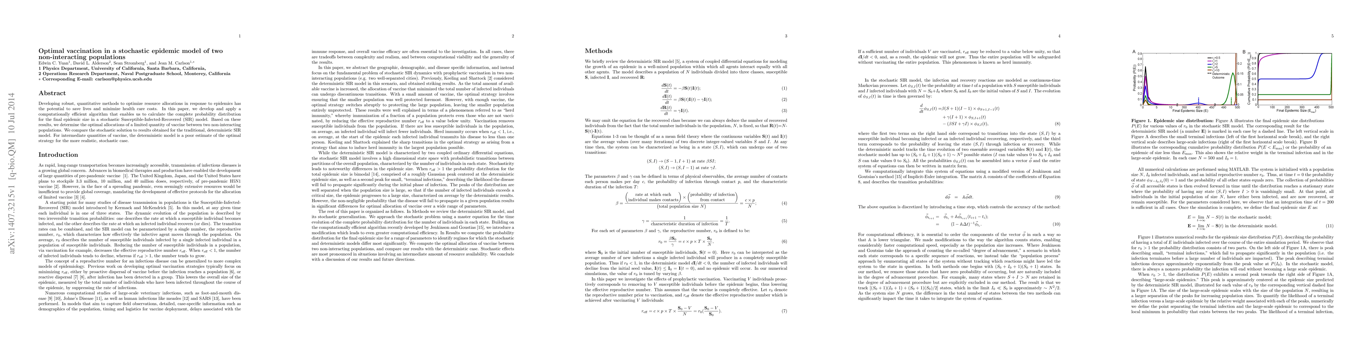 Researchers developed an algorithm to calculate optimal vaccine allocation between two non-interacting populations in a stochastic SIR model, finding that the deterministic model is a poor estimate for intermediate quantities of vaccine.