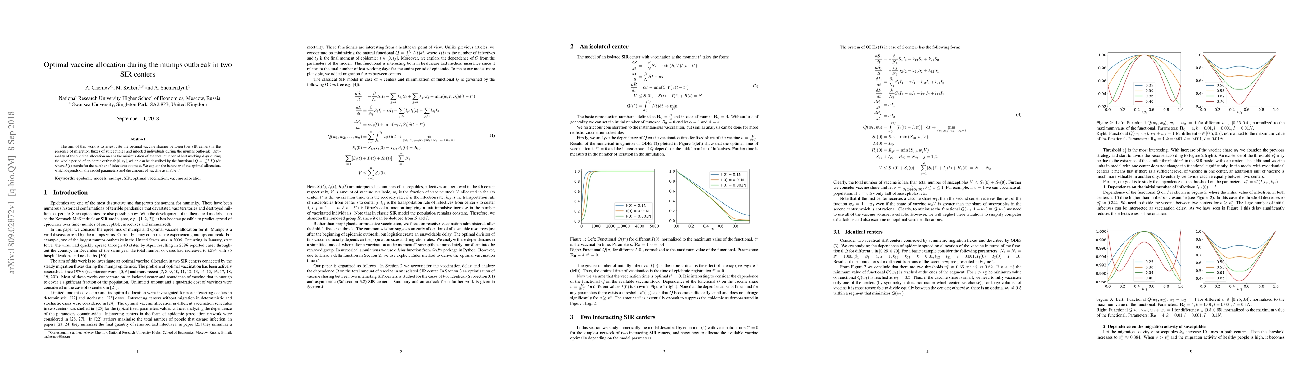 This paper investigates the optimal distribution of vaccines between two SIR centers during a mumps outbreak, aiming to minimize lost working days by reducing the total number of infections. The study analyzes how vaccine allocation varies with model parameters and the available vaccine supply.