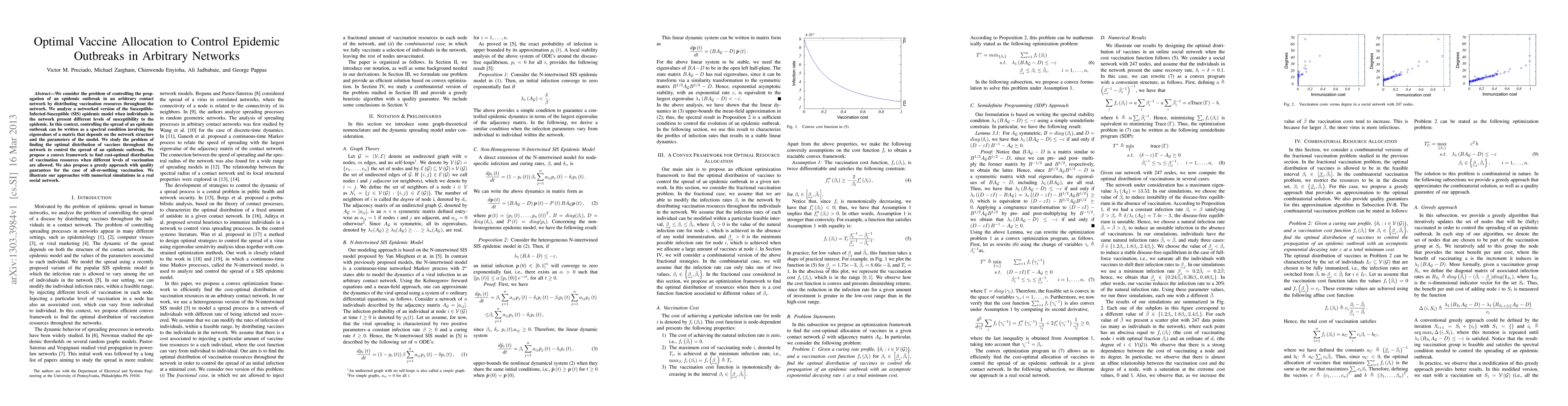 This paper addresses the optimal allocation of vaccines to control epidemic outbreaks in complex networks, proposing a convex framework for cost-optimal distribution and a greedy approach for all-or-nothing vaccination. Numerical simulations on a real social network demonstrate the effectiveness of these strategies.