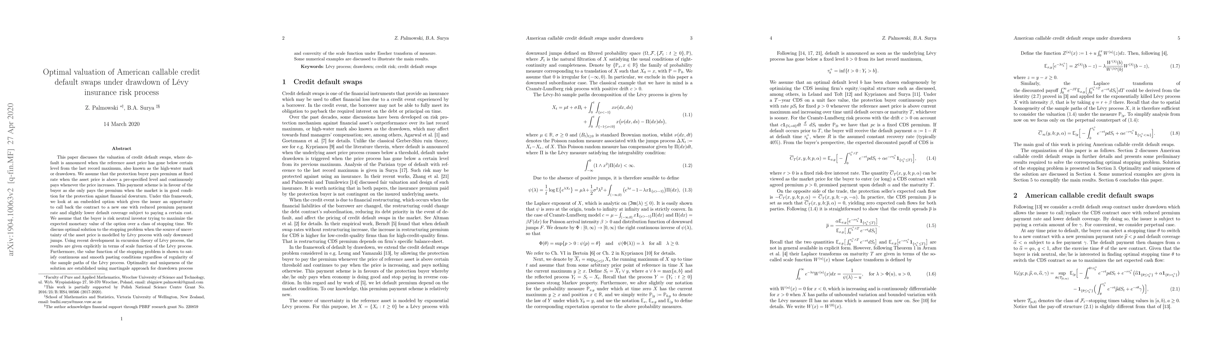 This paper discusses the valuation of credit default swaps, where default is announced when the reference asset price has gone below certain level from the last record maximum, also known as the high-water mark or drawdown. We assume that the protection buyer pays premium at fixed rate when the asset price is above a pre-specified level and continuously pays whenever the price increases. This payment scheme is in favour of the buyer as she only pays the premium when the market is in good condition for the protection against financial downturn. Under this framework, we look at an embedded option which gives the issuer an opportunity to call back the contract to a new one with reduced premium payment rate and slightly lower default coverage subject to paying a certain cost. We assume that the buyer is risk neutral investor trying to maximize the expected monetary value of the option over a class of stopping time. We discuss optimal solution to the stopping problem when the source of uncertainty of the asset price is modelled by L\'evy process with only downward jumps. Using recent development in excursion theory of L\'evy process, the results are given explicitly in terms of scale function of the L\'evy process. Furthermore, the value function of the stopping problem is shown to satisfy continuous and smooth pasting conditions regardless of regularity of the sample paths of the L\'evy process. Optimality and uniqueness of the solution are established using martingale approach for drawdown process and convexity of the scale function under Esscher transform of measure. Some numerical examples are discussed to illustrate the main results.